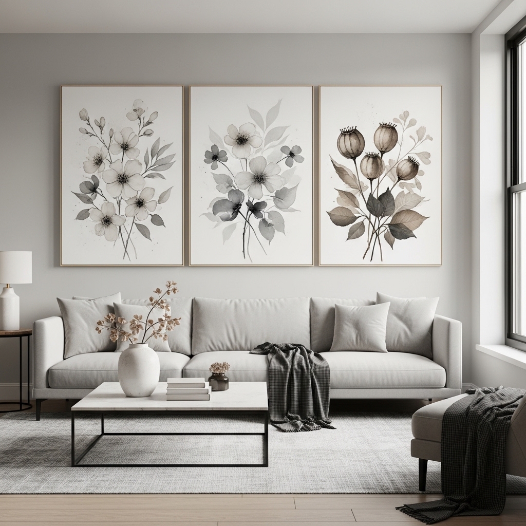 Use a three-panel (triptych) beige gray floral set arranged evenly with consistent spacing. Align the panels horizontally above furniture like beds, consoles, or sofas to create a structured look.