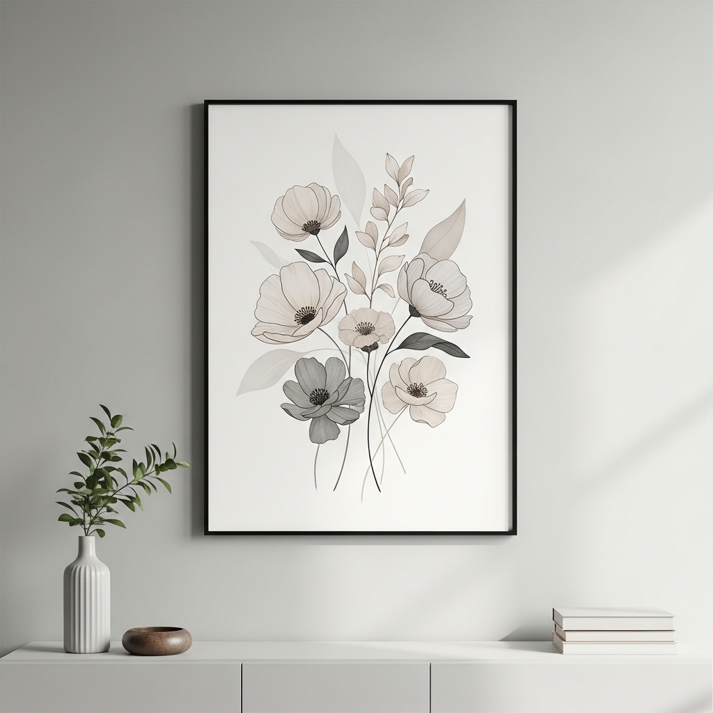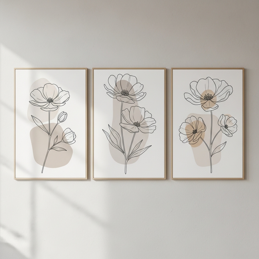 Choose simple floral line drawings in beige and gray tones with lots of white space. Use thin frames or frameless prints to maintain a clean look.