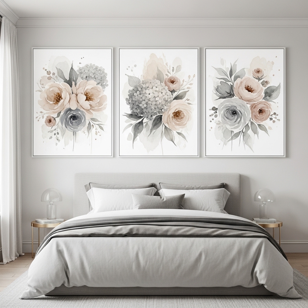 Use watercolor-style beige gray floral art above the bed or dresser. Keep frames light and minimal to maintain softness.
