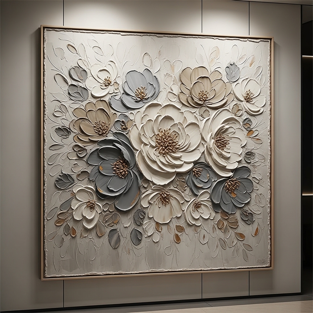 Choose floral wall art with raised textures or layered paint techniques. Place it where light can hit the surface to highlight details.