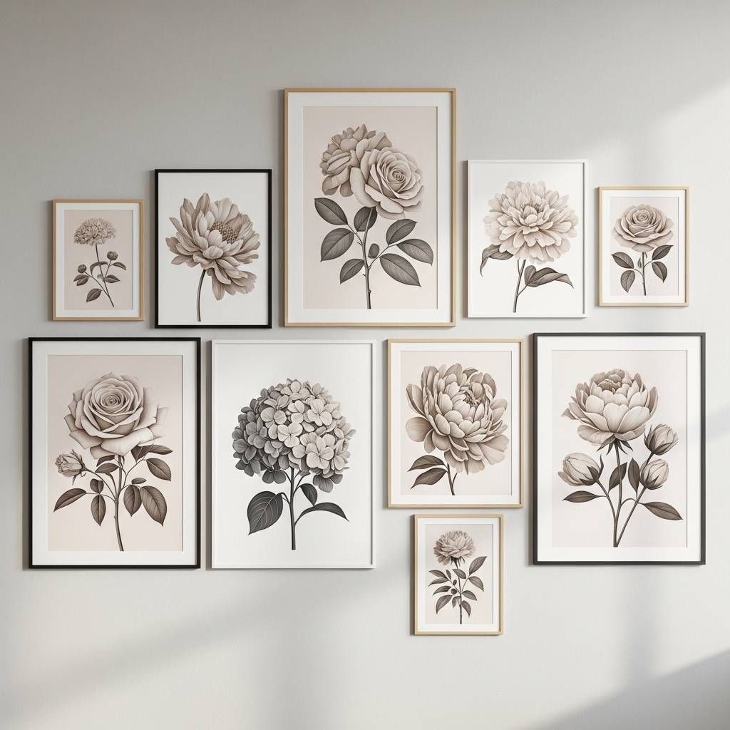 Use black frames around beige gray floral prints to create definition. Position them on white or light-toned walls so the contrast feels intentional rather than heavy. Keep spacing even and layouts simple to avoid visual noise.