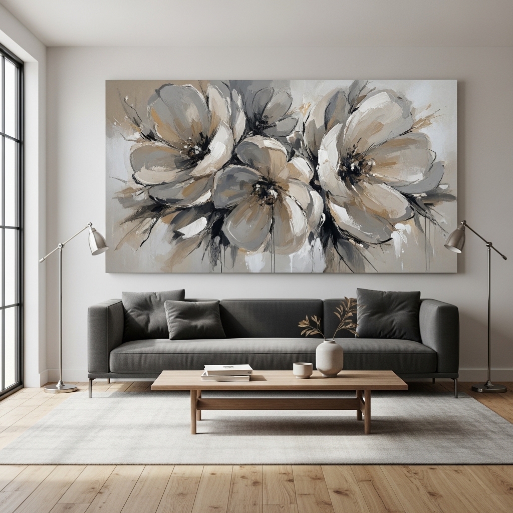 Use one oversized canvas featuring soft beige and gray florals to anchor your seating area. Position it centrally above the sofa, ensuring the artwork width covers at least two-thirds of the furniture below. Keep surrounding decor minimal so the artwork becomes the visual focal point.