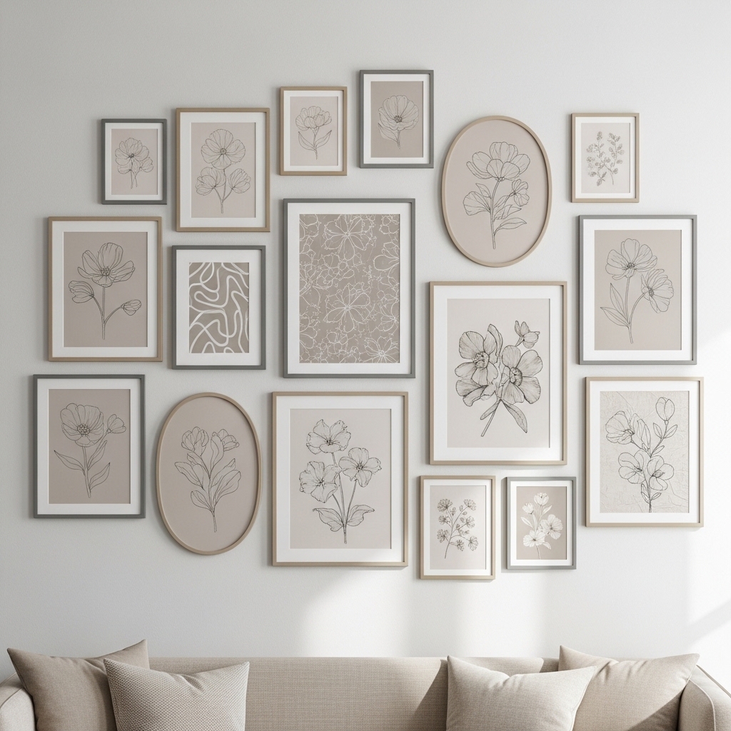 Create a gallery wall using multiple beige gray floral prints in different sizes but consistent color tones. Arrange them in a balanced layout around a central piece.