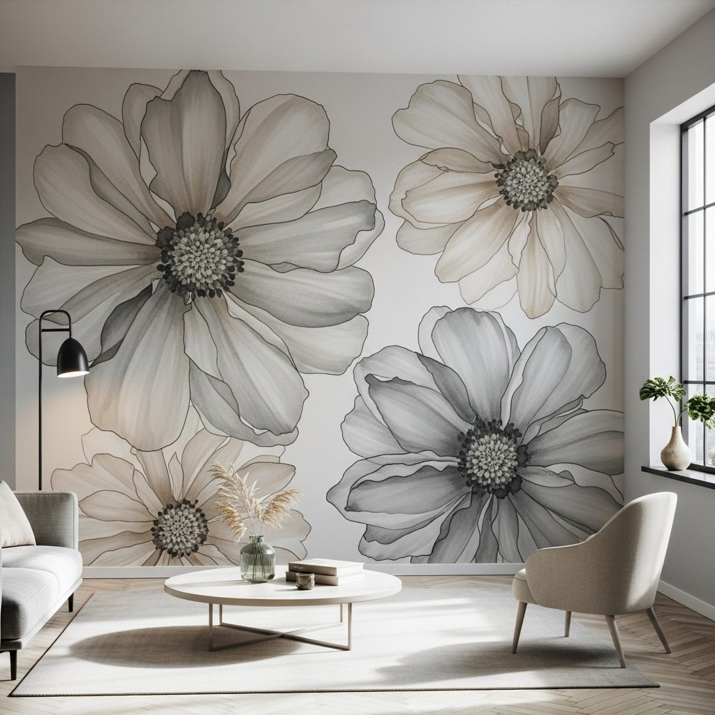 Use a large-scale beige gray floral mural or wallpaper to cover an entire wall. Keep furniture simple to let the design stand out.