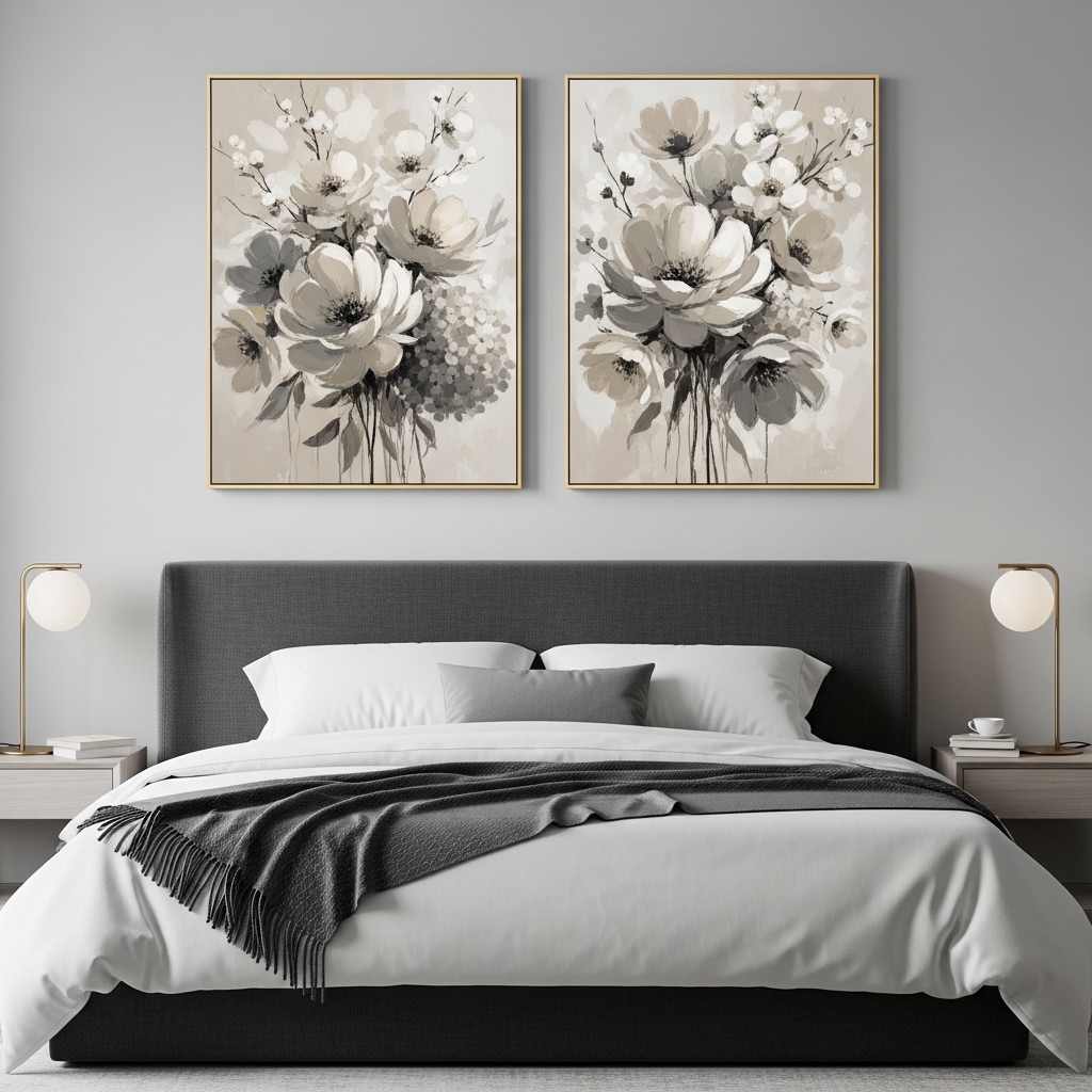 Use two medium-sized beige gray floral canvases placed evenly above the bed. Align them with the width of the headboard and keep equal spacing between them. This creates a balanced, hotel-like aesthetic.