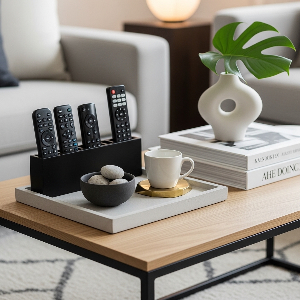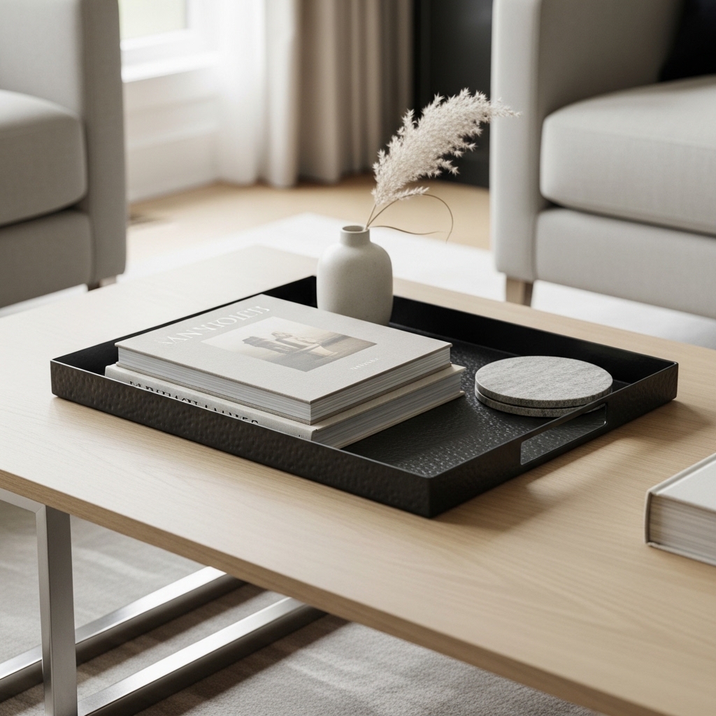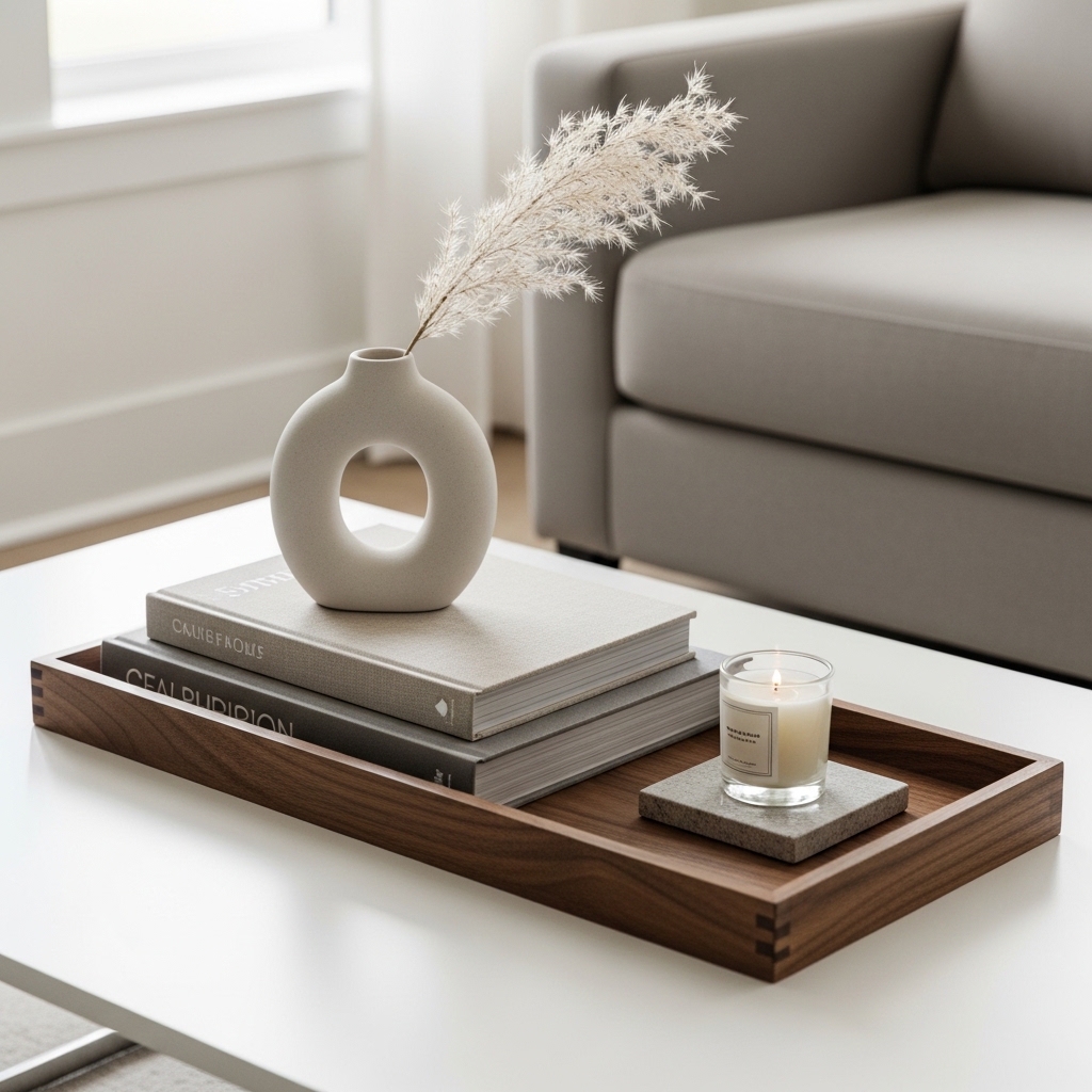 Place a sleek tray—wood, metal, or matte finish—at the center of the table and group 2–3 items inside it, such as a candle, coaster set, or small decor piece. Keep spacing tight within the tray while leaving the outer table surface clear.