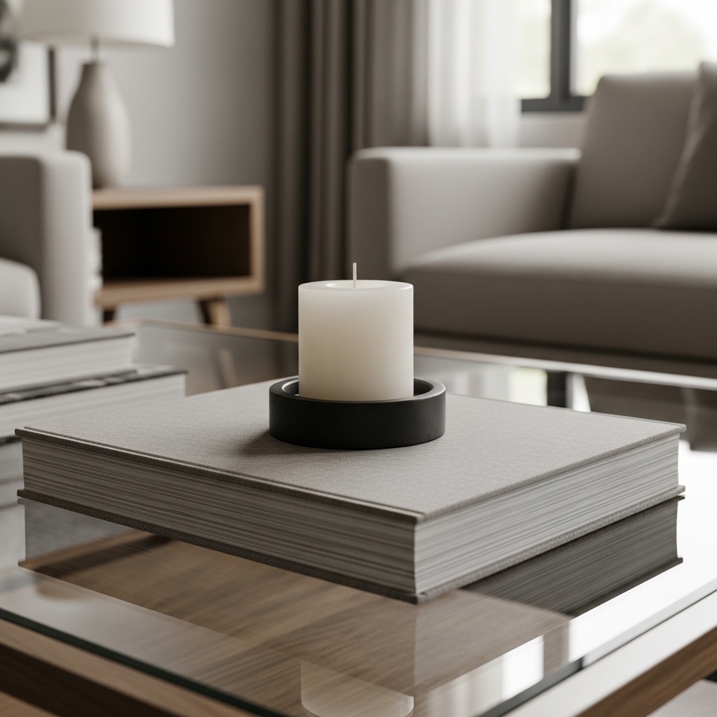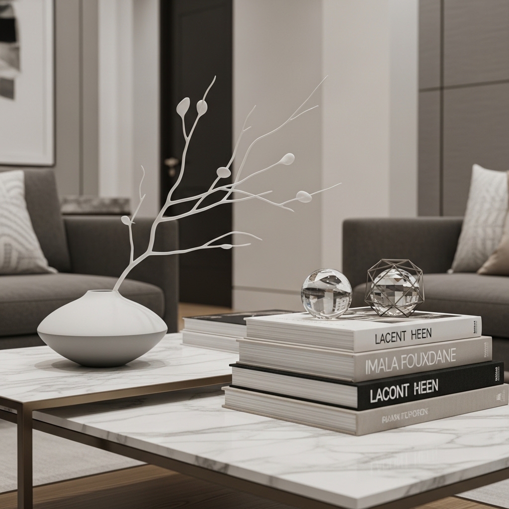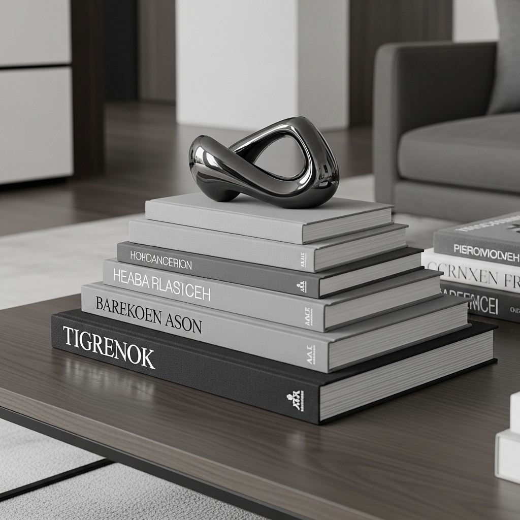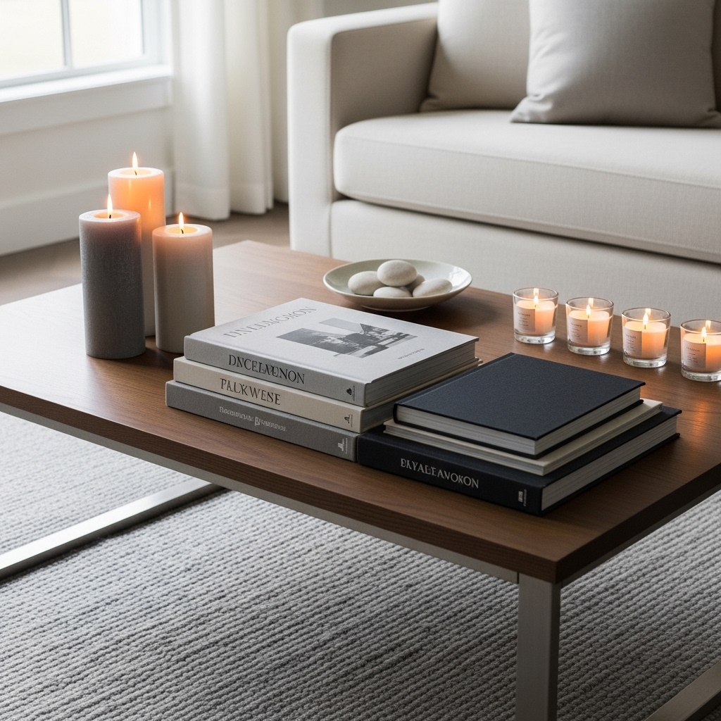 Start by stacking two or three books in a single color palette—black, white, or beige—to create a clean base. Place a small sculptural object or candle on top, keeping the arrangement slightly off-center to avoid a rigid look. This setup works best when you want a refined focal point without filling the entire table.