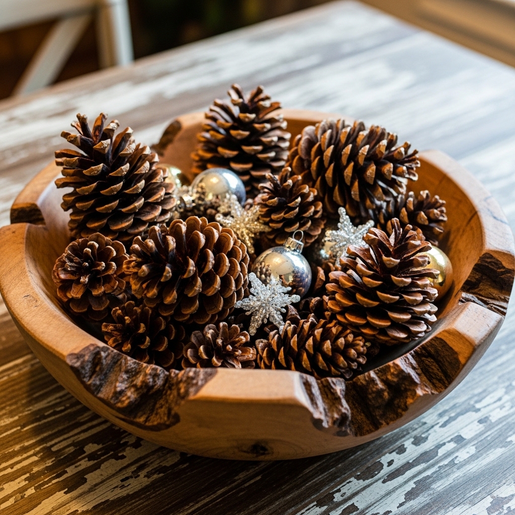 8. Wooden Bowl Filled with Pinecones or Ornaments
