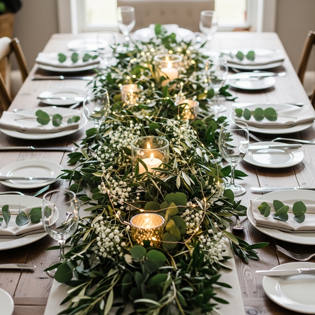 Use eucalyptus, salal, or ivy. Lay the stems end to end down the center. Tuck in small candles or flowers along the runner.