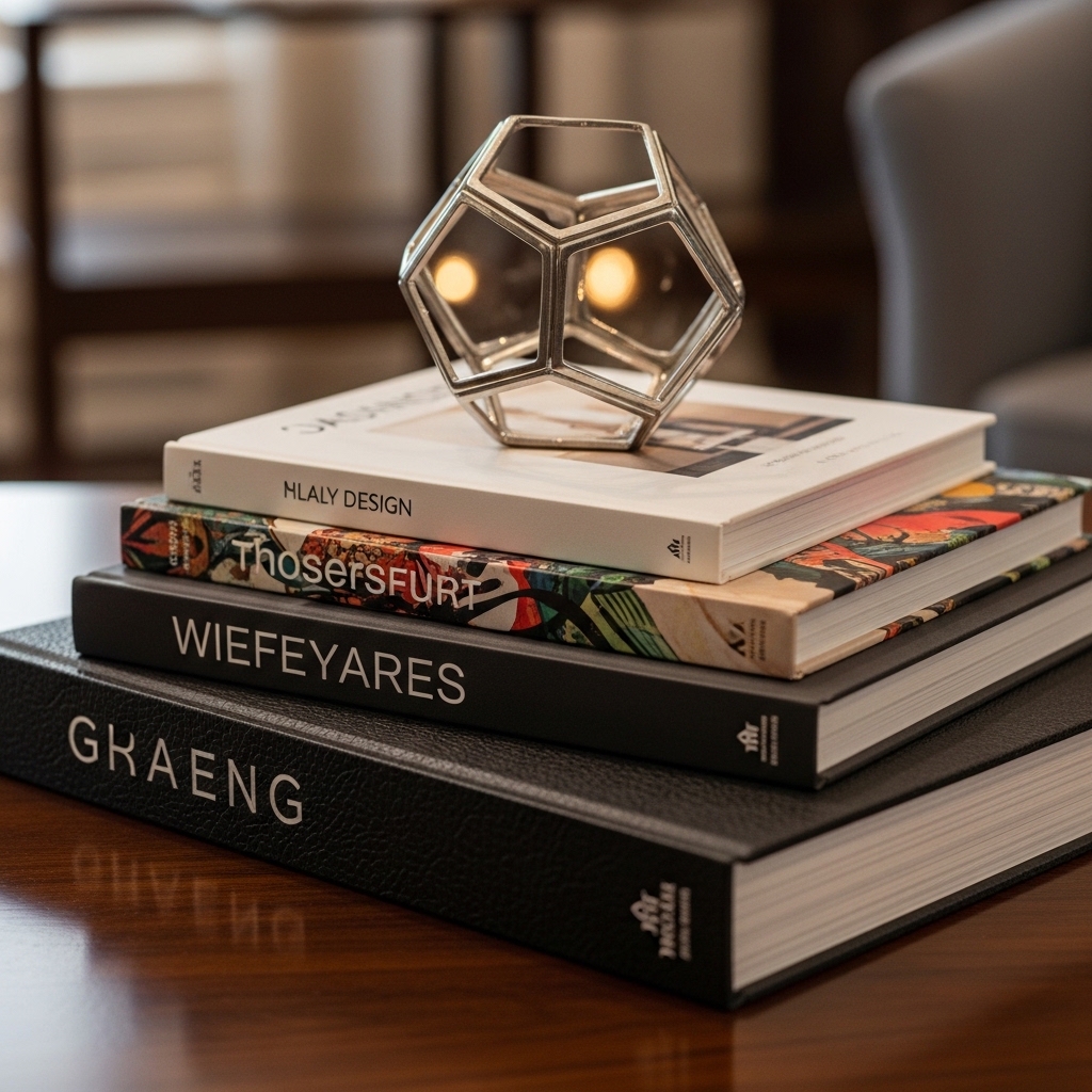 Books add height, color, and intellectual warmth. A stack of three books becomes a pedestal for a small object.