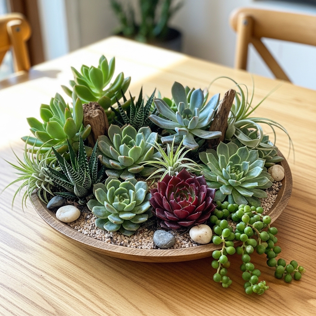 Succulents are sculptural and low-maintenance. A tray of succulents becomes a living centerpiece that lasts for months.