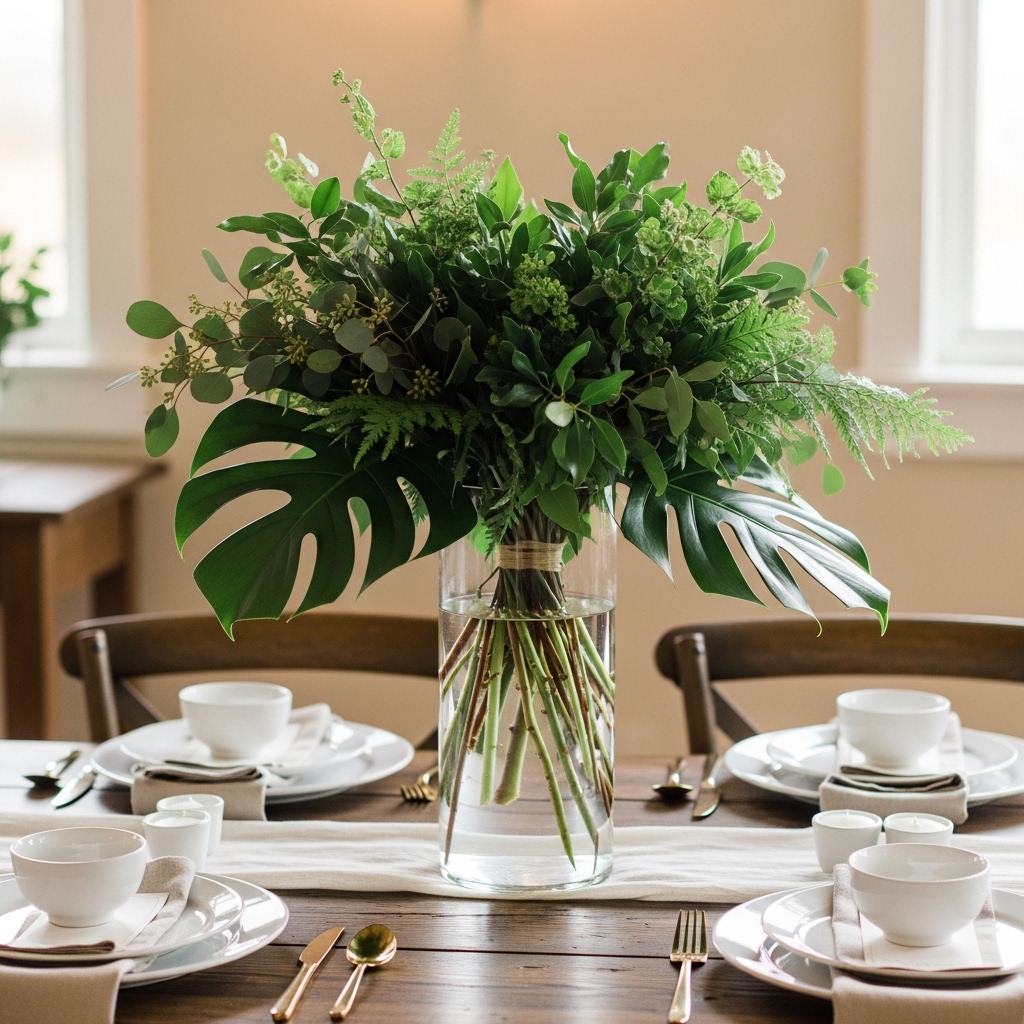 One large vase makes a stronger statement than several small ones. Fill it with fresh eucalyptus, olive branches, or monstera leaves.