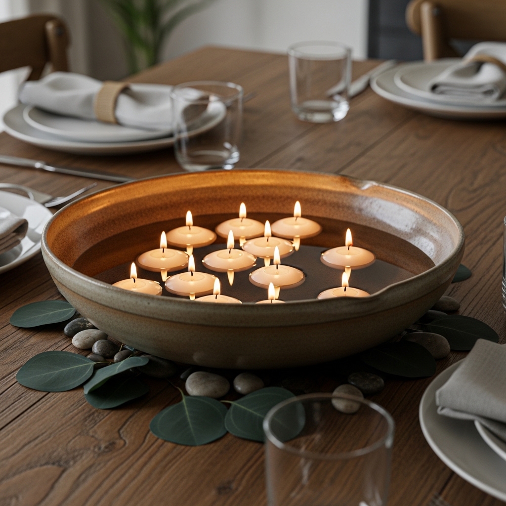 A shallow bowl filled with water holds floating candles. The water reflects the flame. The effect is calm and elegant.