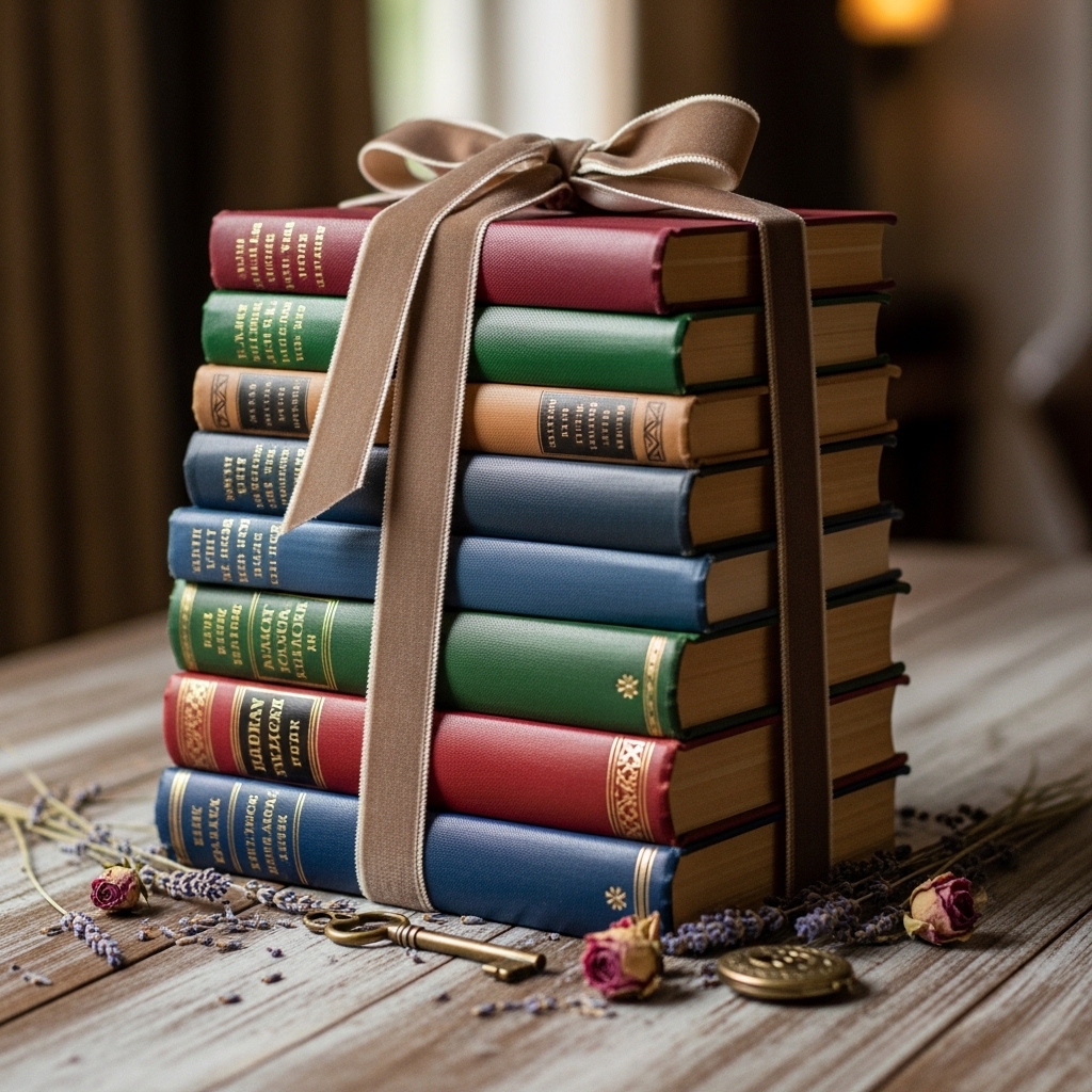 Choose books in complementary colors. Tie them with a wide ribbon. Place a small object on top—a candle, a vase, or a small frame.