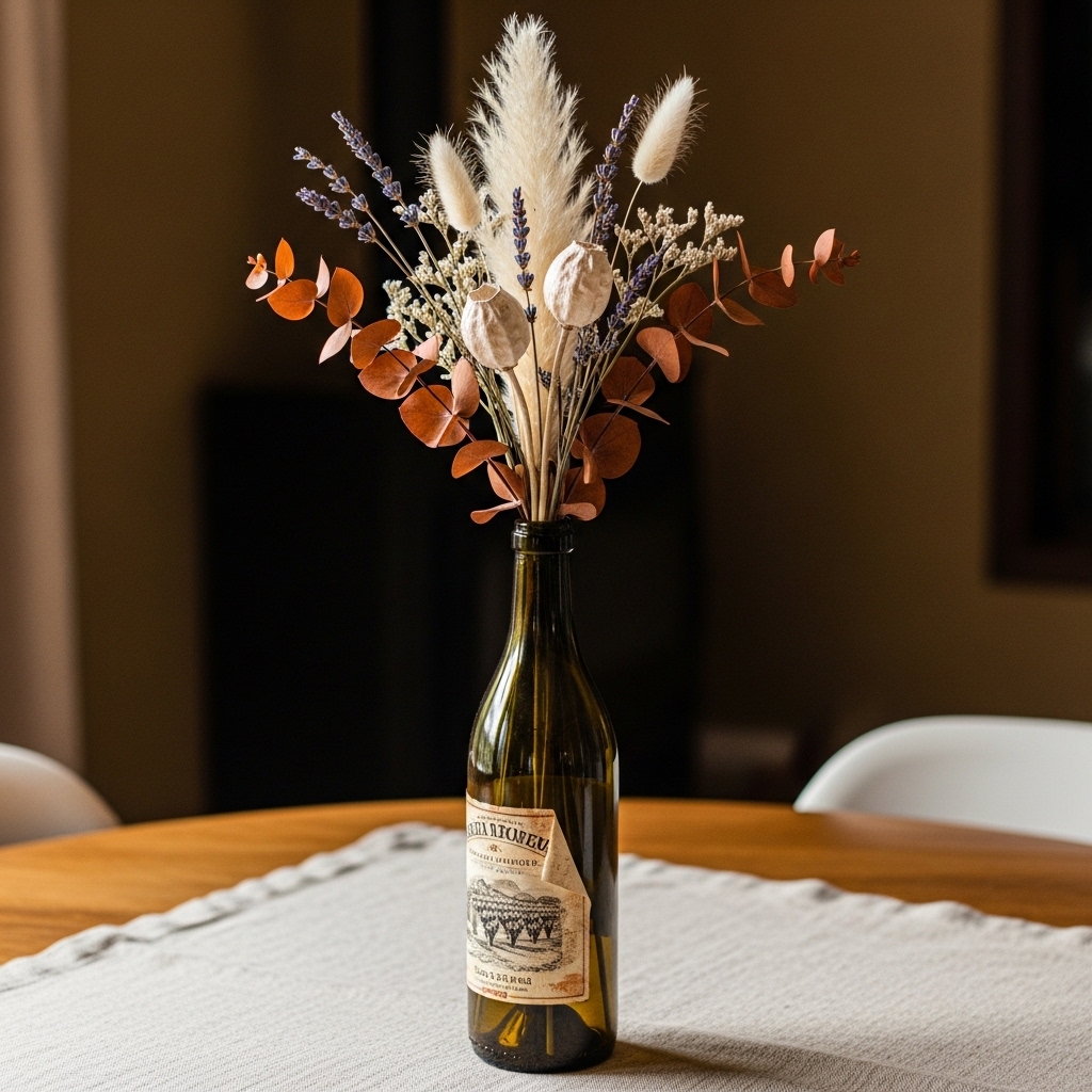 An empty wine bottle becomes a vase. The label adds character. The dried flowers last for months.