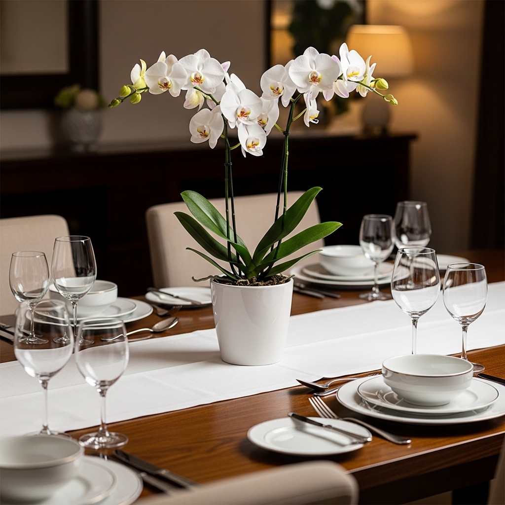 Place a single orchid in a simple pot. Use a pot that complements the table—white ceramic, terracotta, or brass. No other decorations needed.