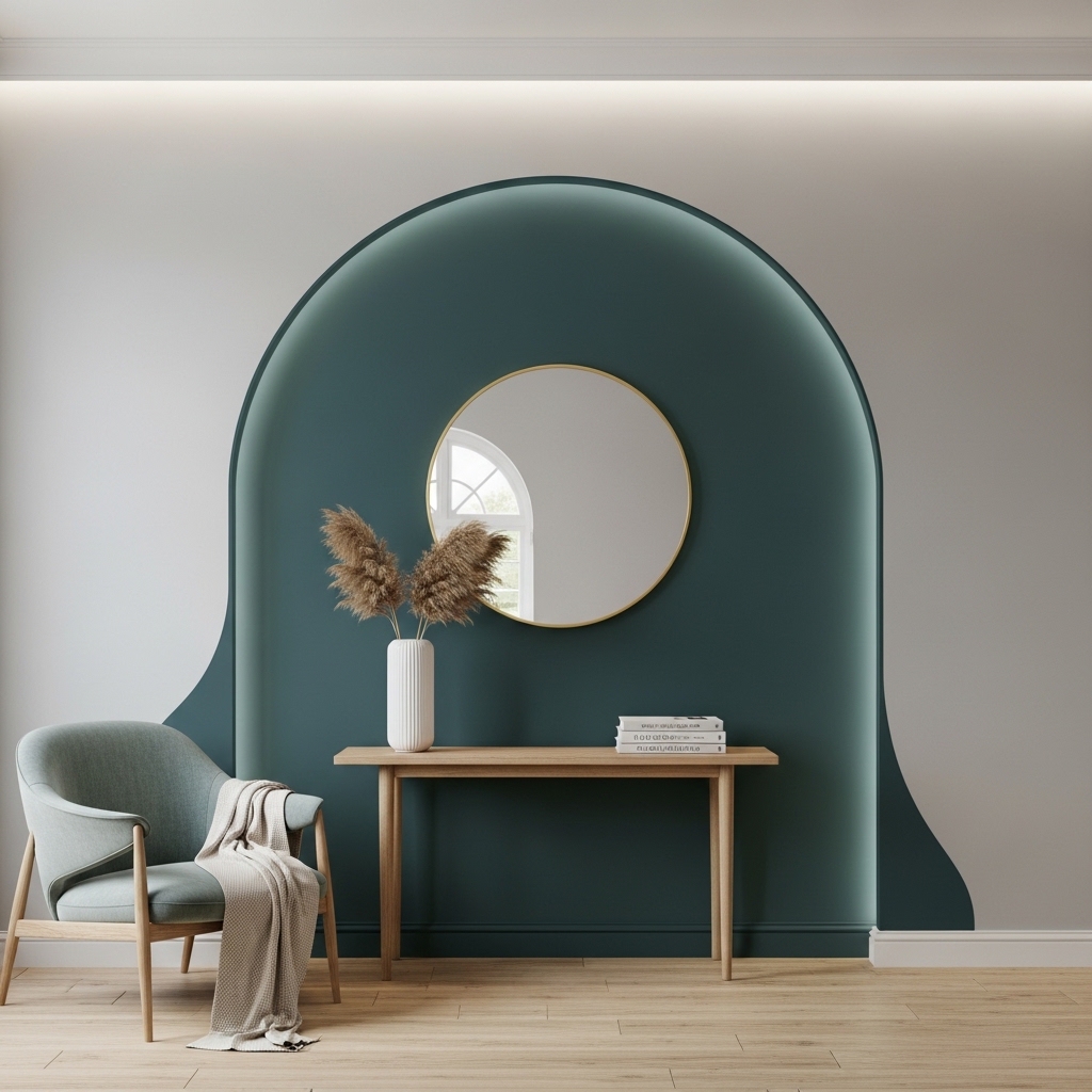 Paint an arch shape behind furniture to frame the focal area visually. Keep proportions centered with the bed, sofa, or console. Use soft curves for a modern aesthetic and ensure clean edges.