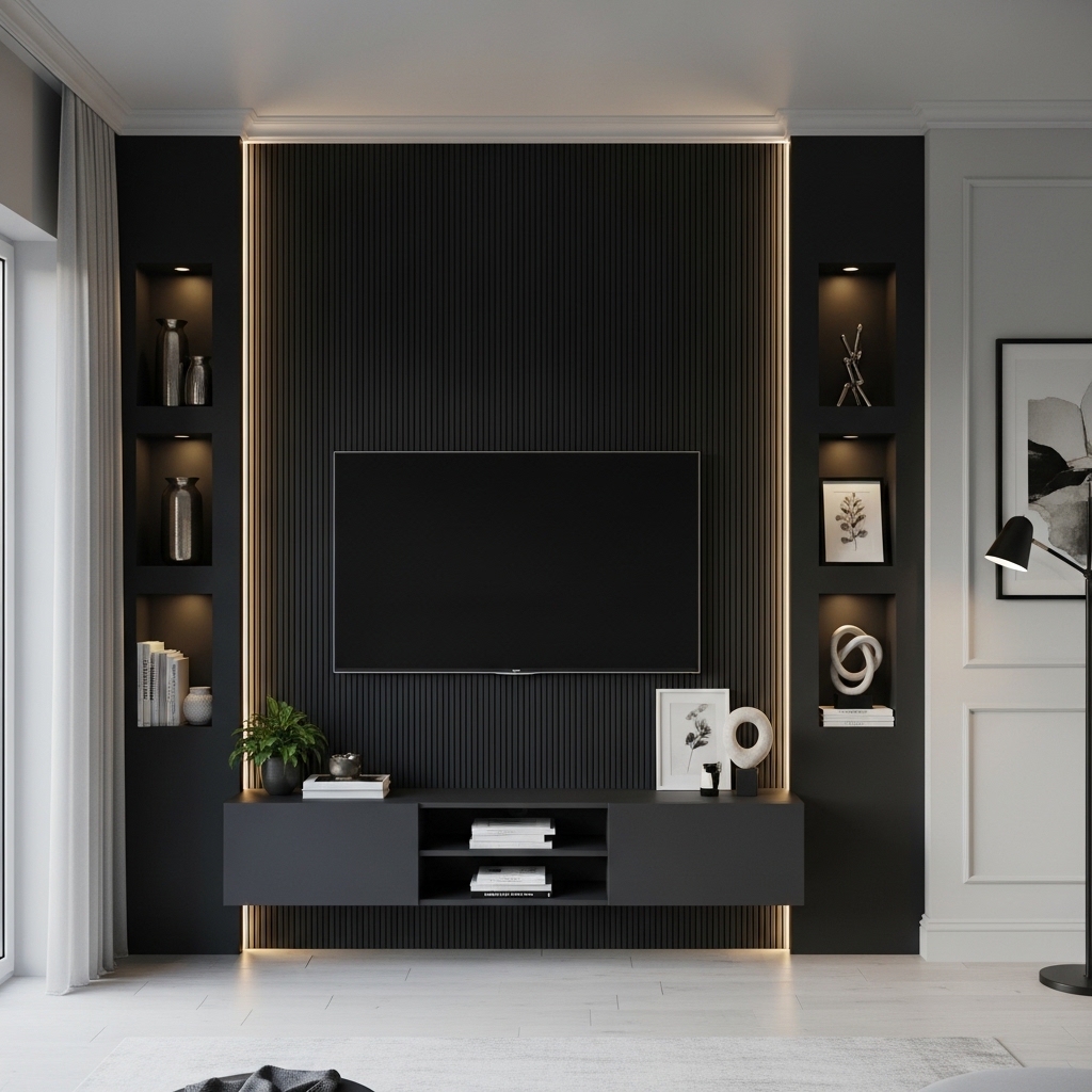 This works because darker tones absorb light and help the TV blend into the wall when not in use. It enhances viewing comfort and reduces eye strain. Glossy finishes can create unwanted reflections.