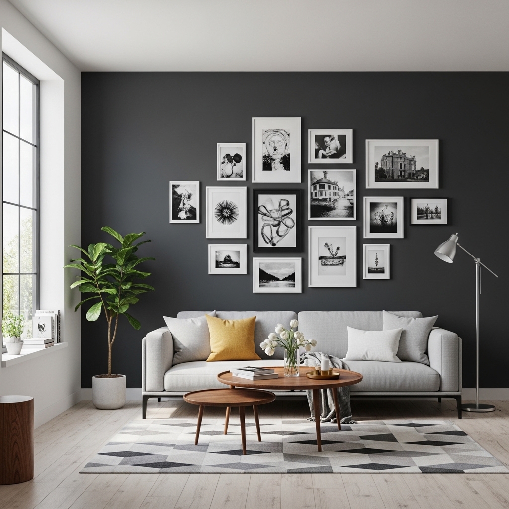 Arrange framed artwork or photographs in a cohesive layout using a consistent theme or color palette. Maintain equal spacing and balance between frames to avoid cluttered appearance. Start with a central anchor piece and build outward.