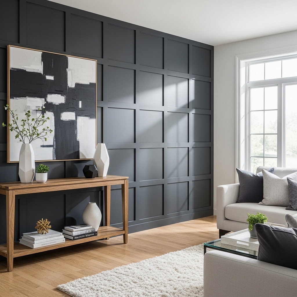 Install vertical and horizontal trim to form structured rectangular or square patterns. Paint the entire wall in one unified color for a clean and cohesive finish. Ensure equal spacing between all panels for a professional look.