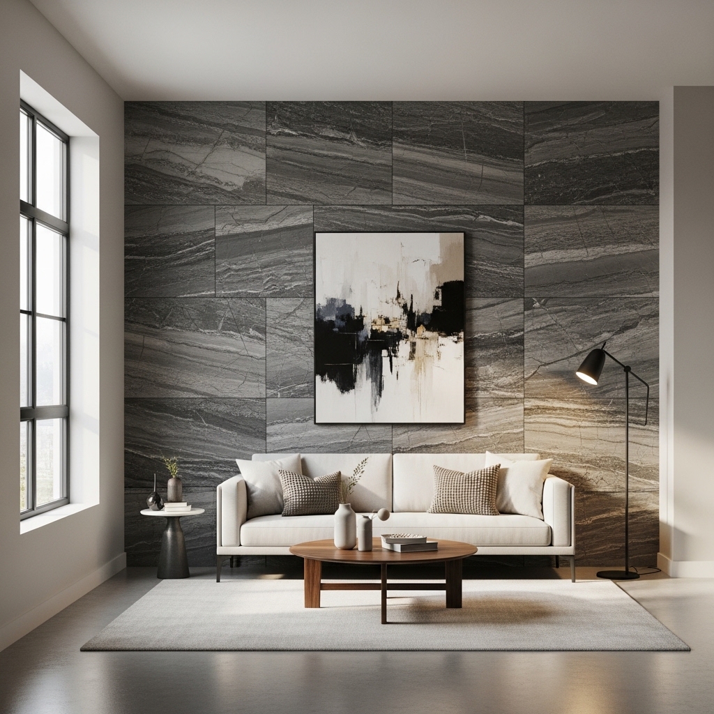 Install stone or faux-stone panels on a primary wall, often behind fireplaces or seating areas. Keep surrounding decor minimal so the texture becomes the main focus. Choose neutral stone tones for versatility across different styles.