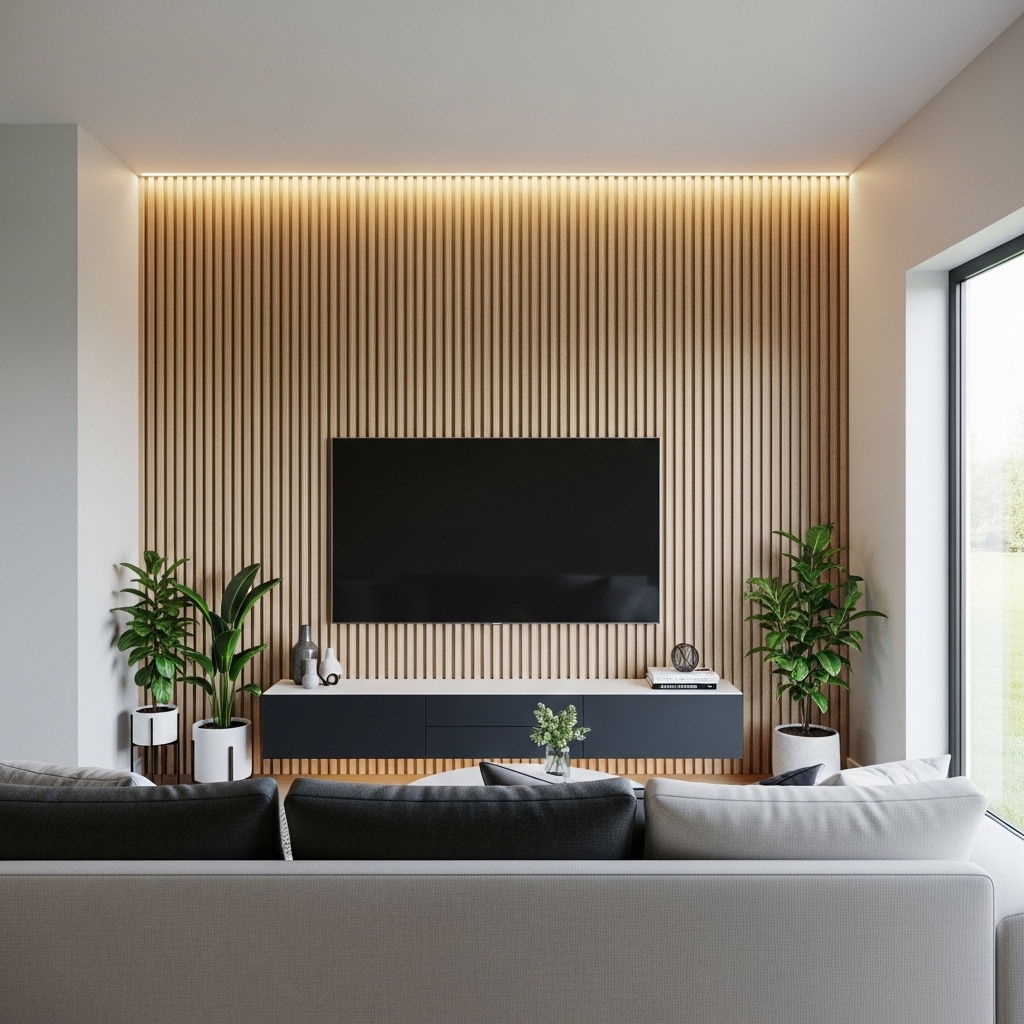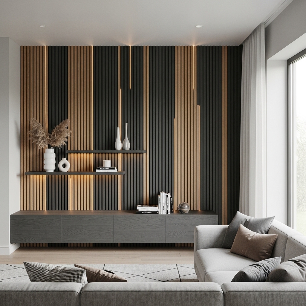 Install evenly spaced vertical wooden slats on a feature wall, typically behind the bed, sofa, or TV unit. Choose light oak for soft modern interiors or darker walnut for dramatic contrast. Maintain consistent spacing and alignment to ensure a clean architectural finish.