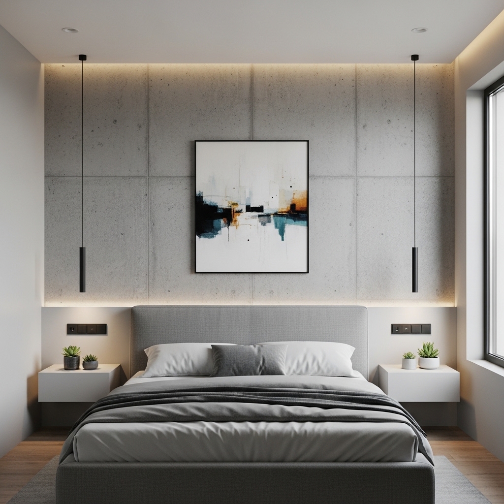 Apply concrete or cement finish on one wall for an industrial look. Keep decor warm to balance the raw texture.