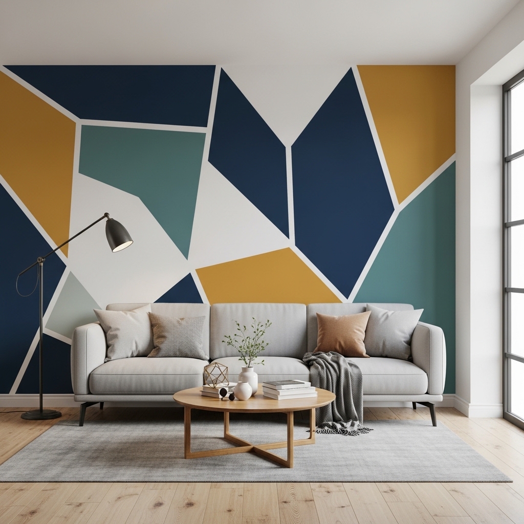 Use painter’s tape to create geometric patterns with two or three coordinated colors. Ensure shapes are evenly spaced and visually balanced across the wall.