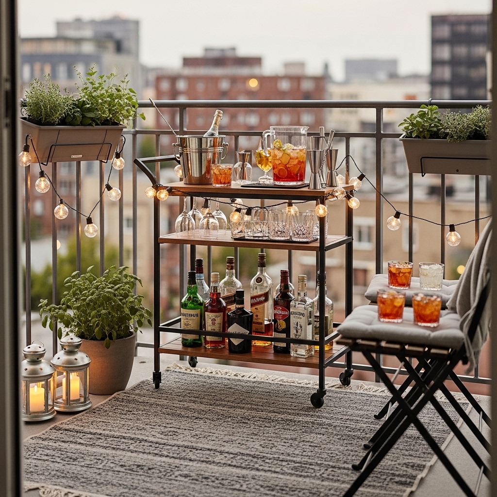 Use a small bar cart for drinks, snacks, or decor. Keep it mobile for flexibility.