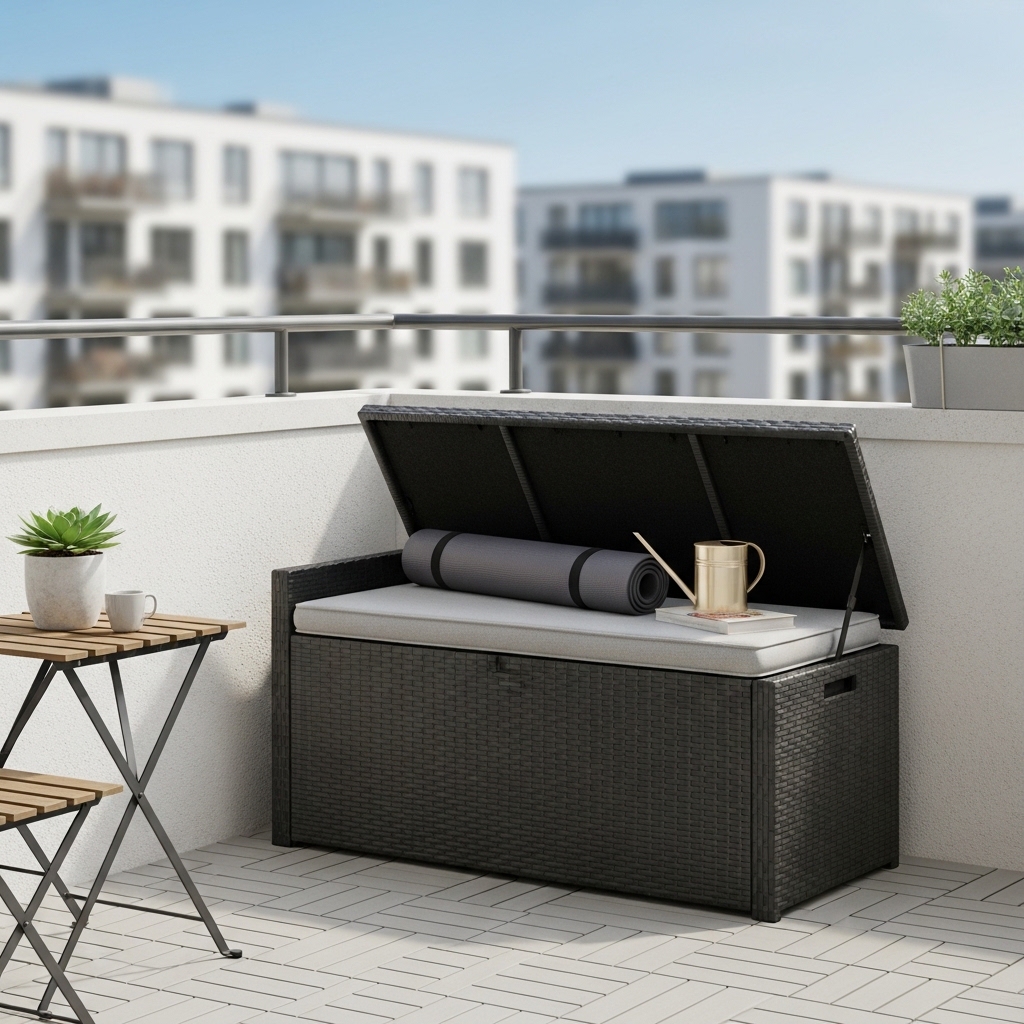 Use a bench with internal storage for cushions, tools, or accessories. Place it against a wall.