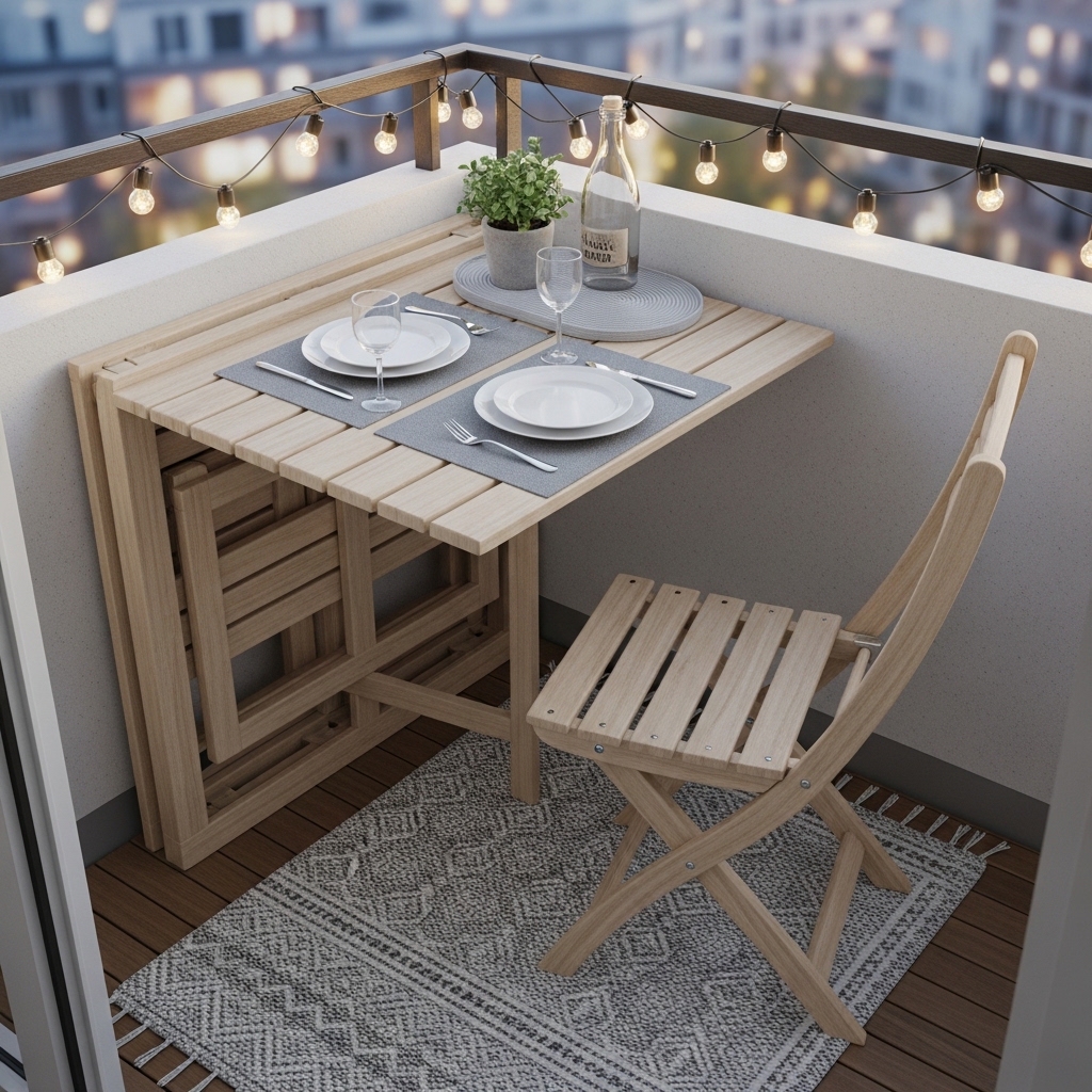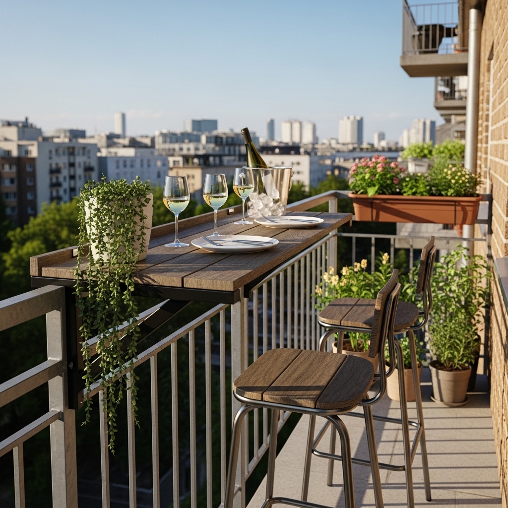 Attach a narrow bar-style table to the railing and pair it with foldable stools. Use it for coffee, meals, or laptop work.