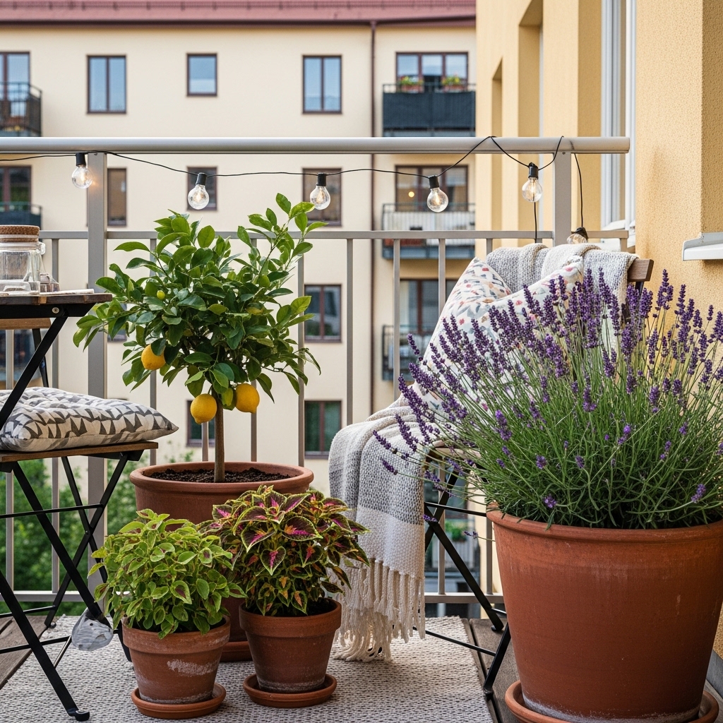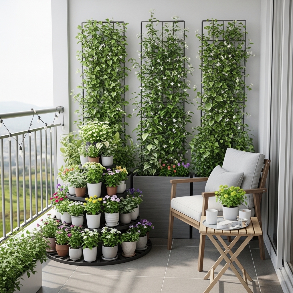 Group plants in one corner using tiered stands or stacked arrangements. Keep the rest of the balcony open for movement.