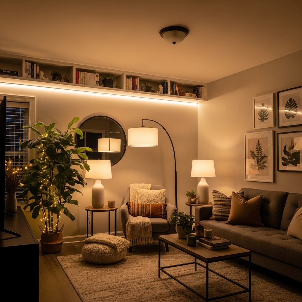 How to apply: Combine floor lamps, table lamps, and warm bulbs.