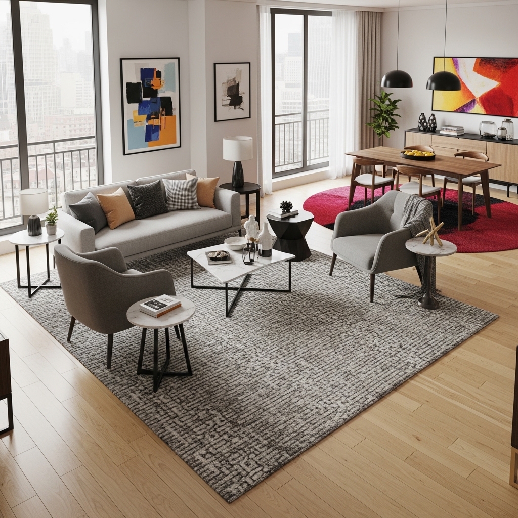 How to apply: Use one rug per zone and keep furniture partially on it.