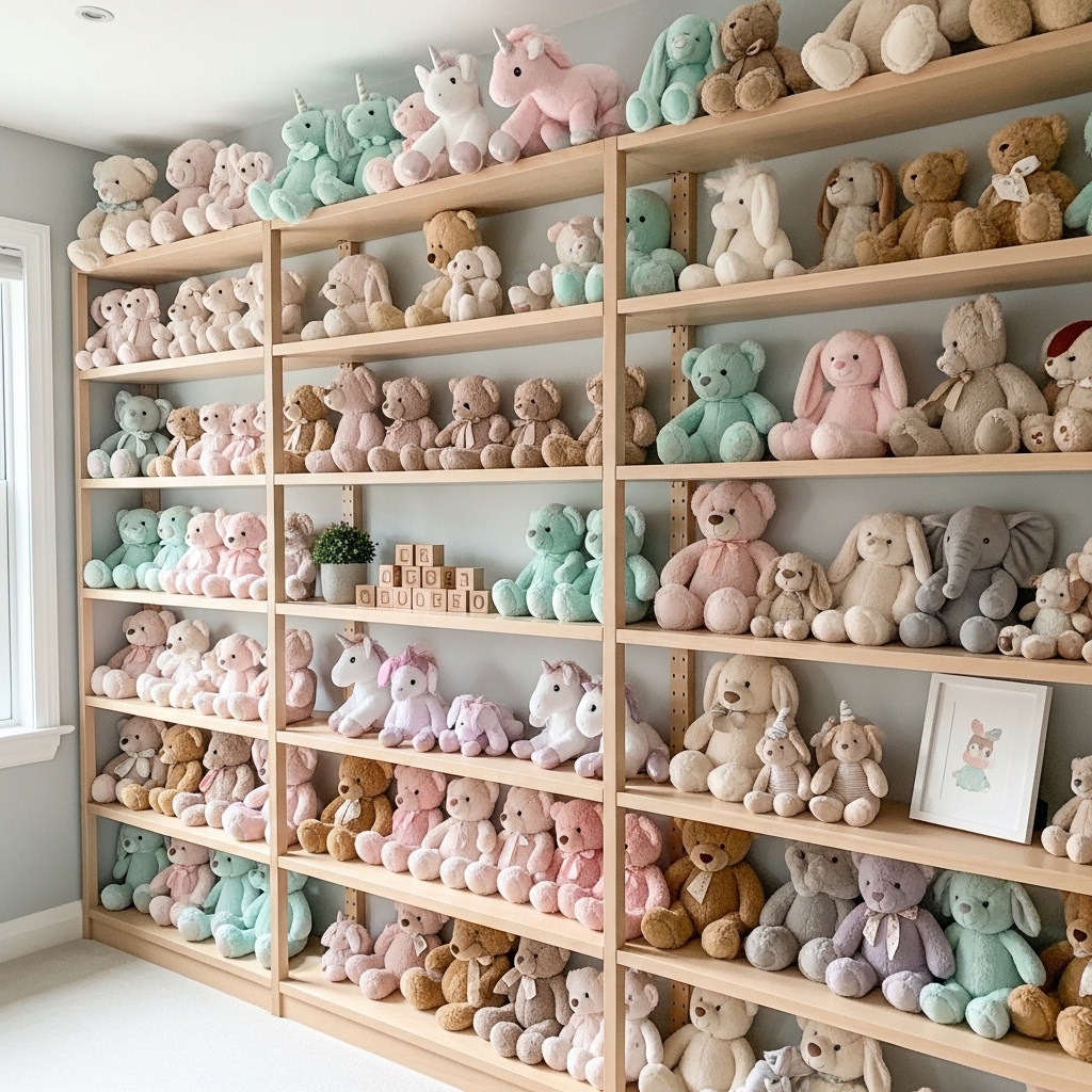 Mount three to four long floating shelves on one wall. Arrange stuffed animals by size or color.
