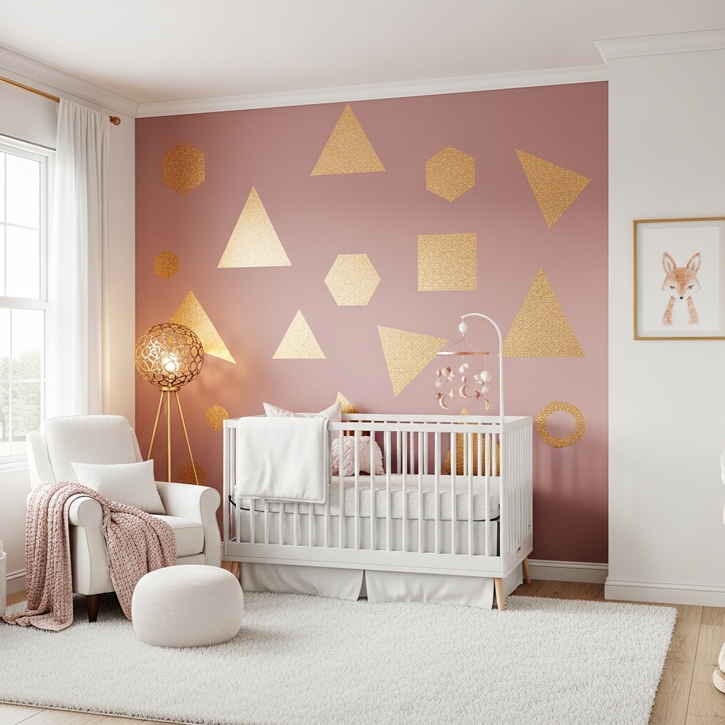 Paint one accent wall in dusty rose or blush. Add hand-painted or decal gold triangles, diamonds, or arches.