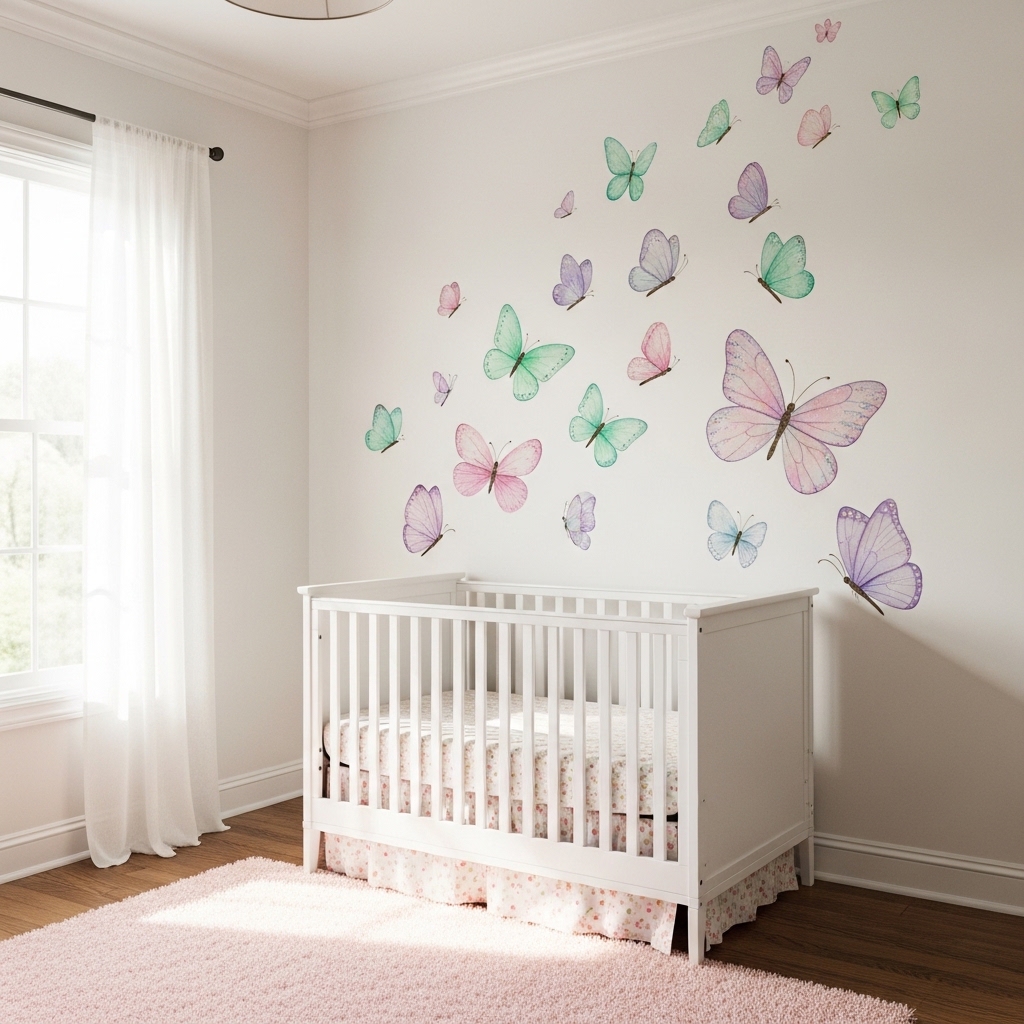 Pro Tip: Paint a few butterflies extending onto the ceiling. The flight path continuing upward adds magic.