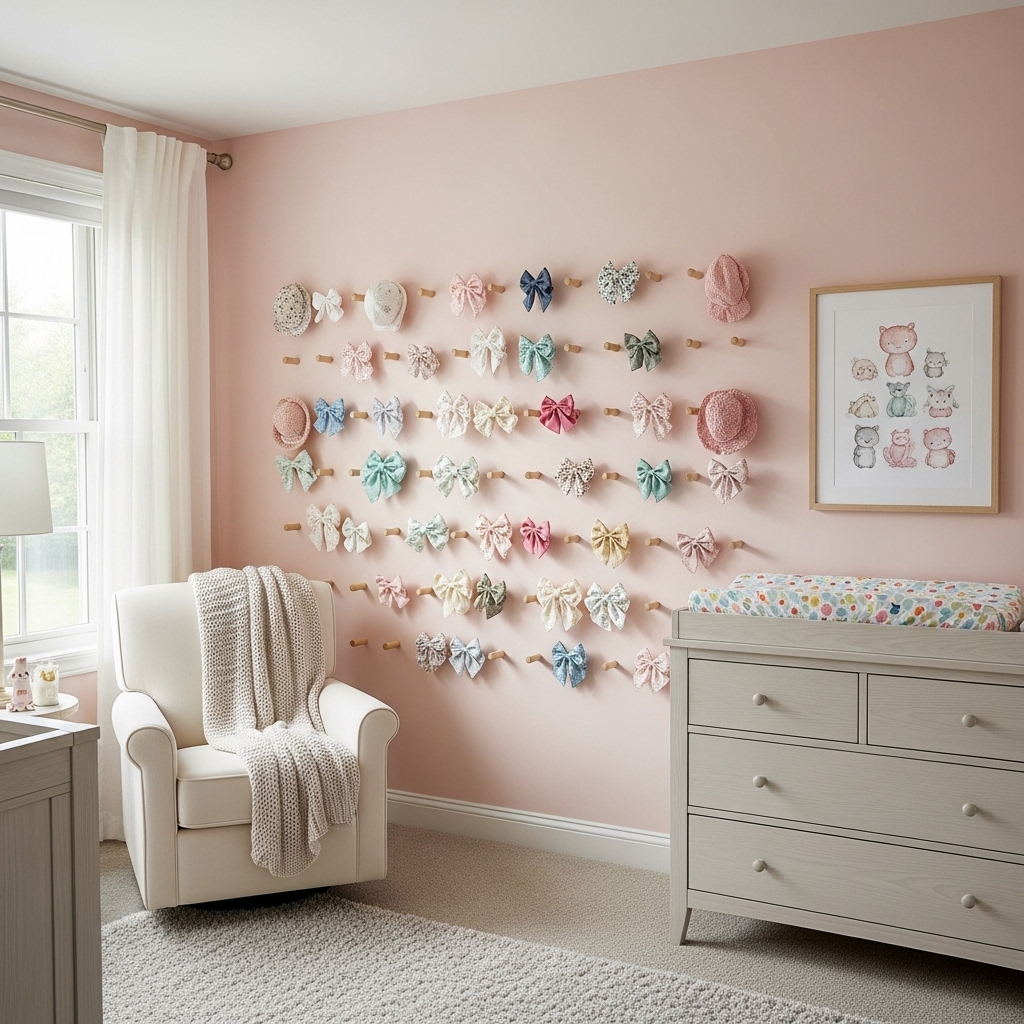 Mount a row of colorful wooden pegs on a wall at adult height. Hang bows, headbands, and sun hats.