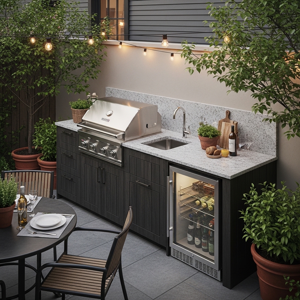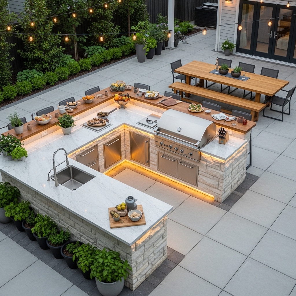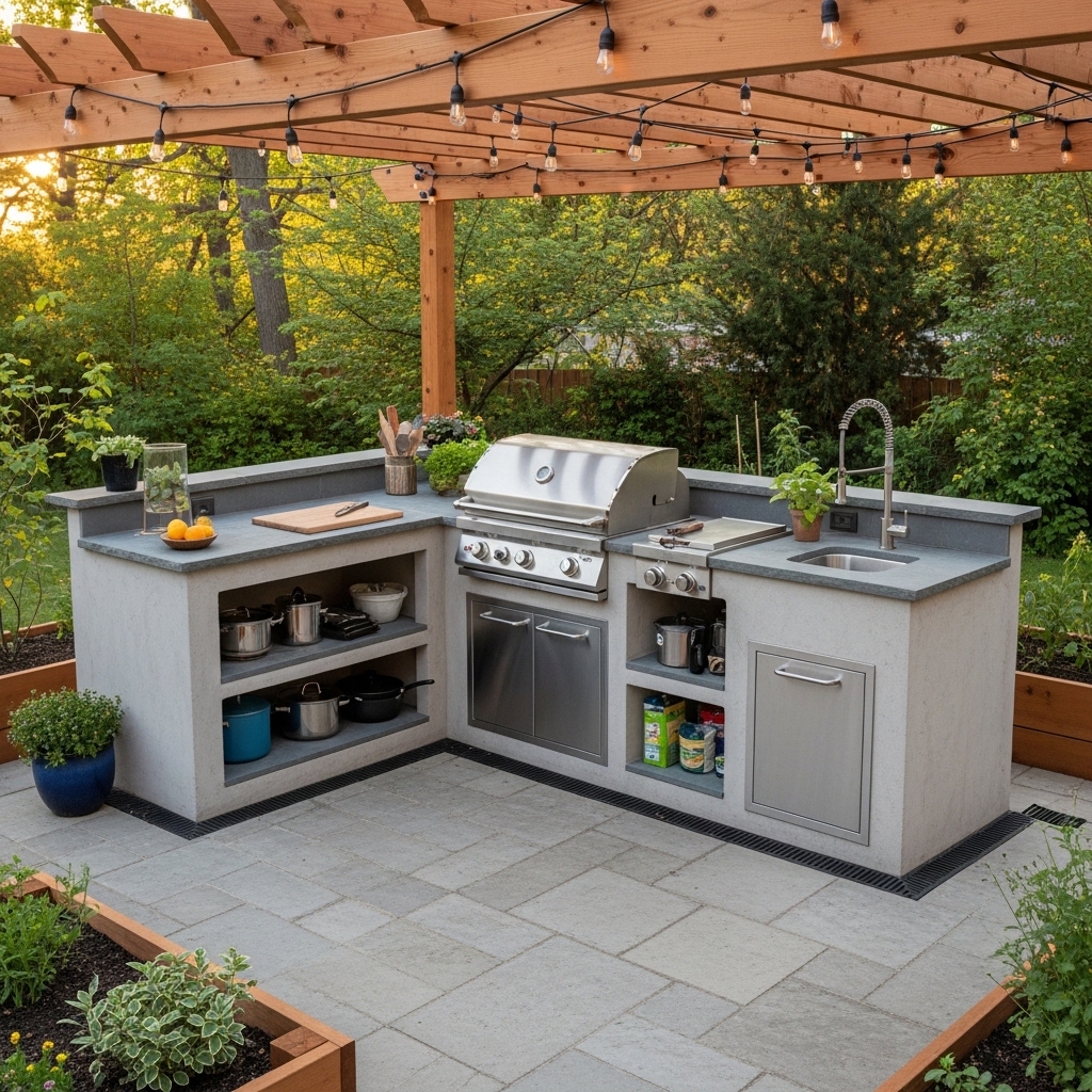 Choose materials like stainless steel, stone, or sealed concrete for surfaces and appliances.