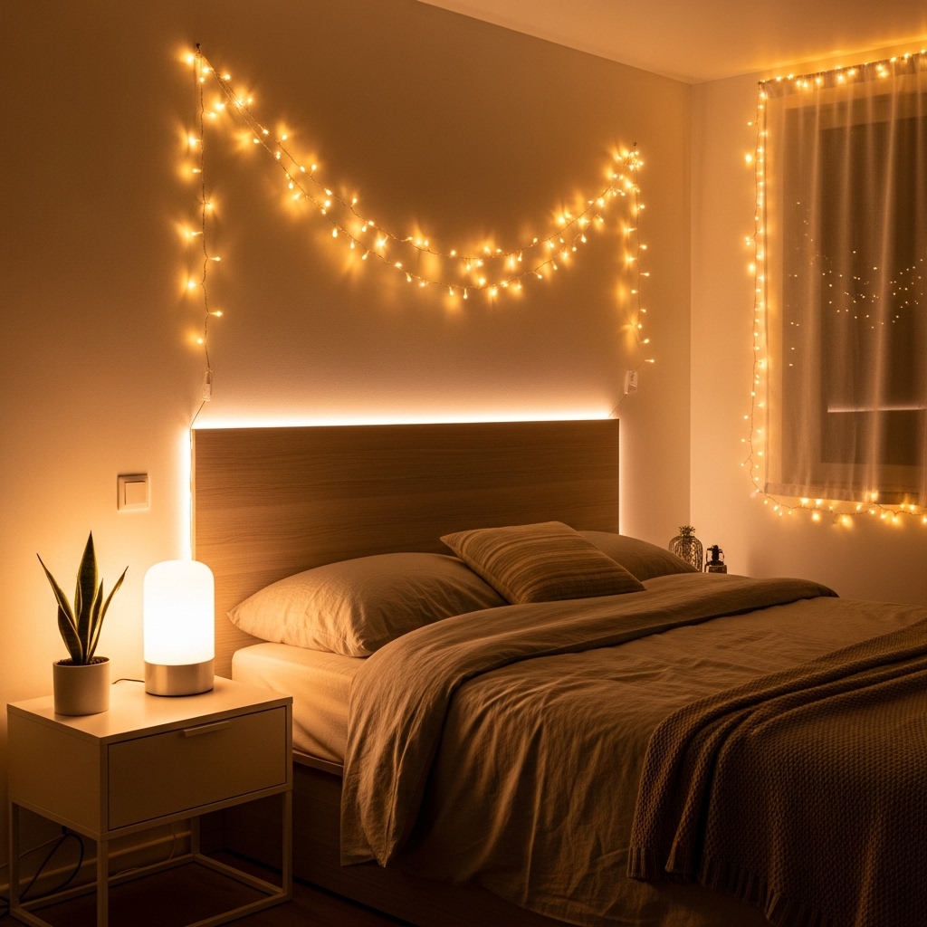 LEDs are energy-efficient and can be styled above headboards, shelves, or mirrors.