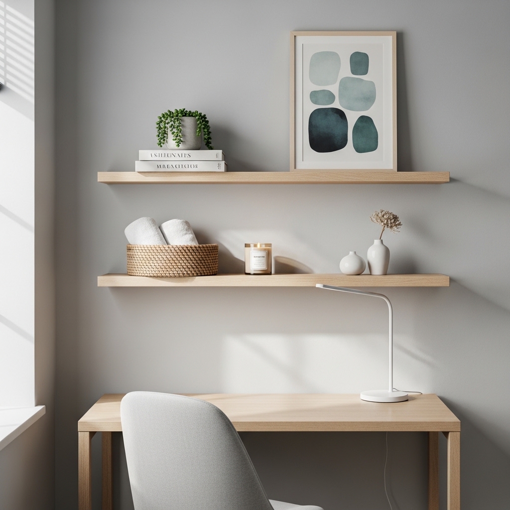 DIY or pre-made floating shelves are perfect for keeping decor organized and stylish. They allow display of books, plants, photos, or small art pieces while saving floor space.