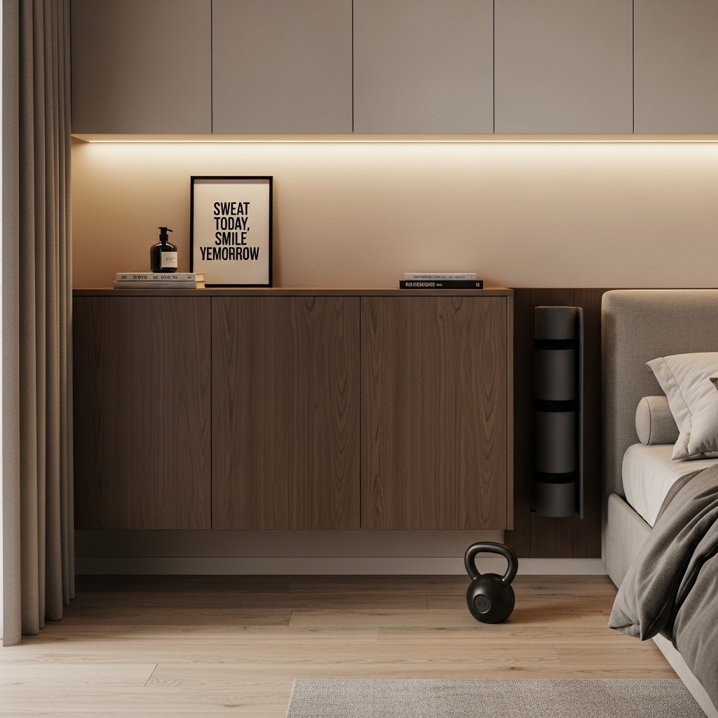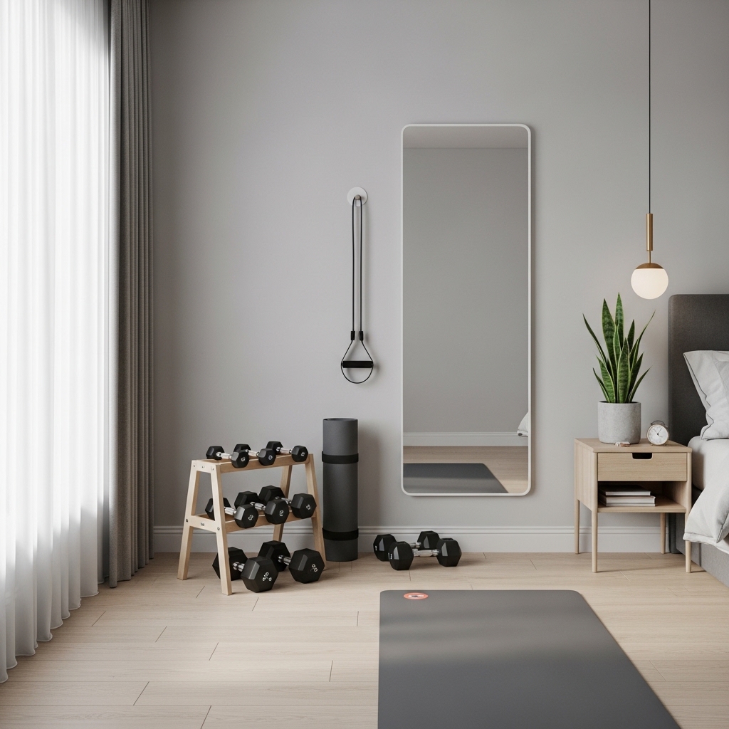 Pro Tip: Use one statement wall or mirror to anchor the gym area without overwhelming the bedroom.