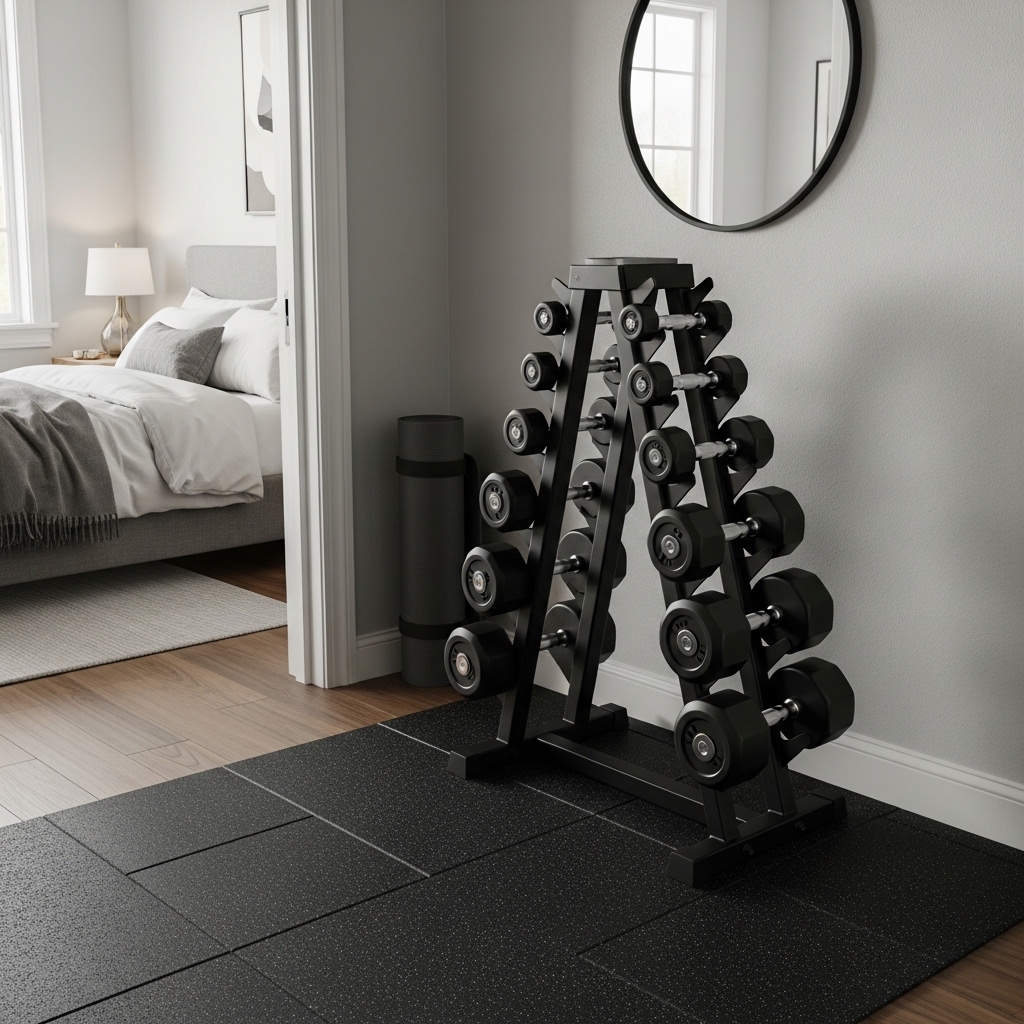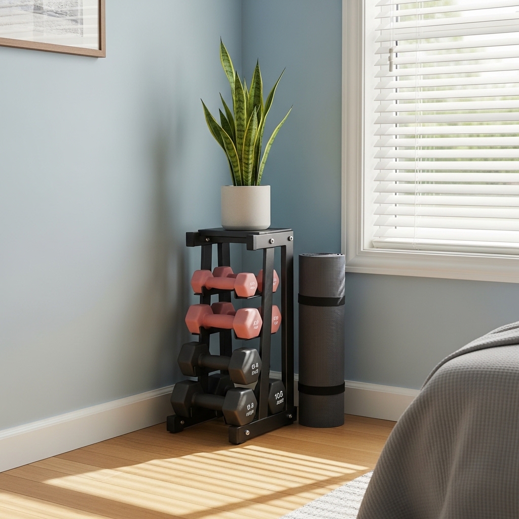 A compact dumbbell rack is perfect for keeping your weights organized without cluttering your bedroom floor.