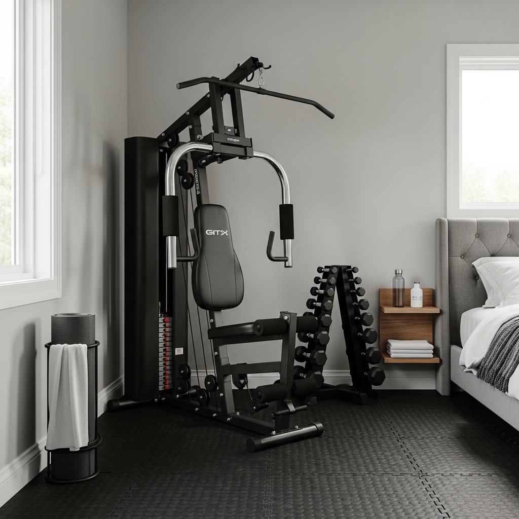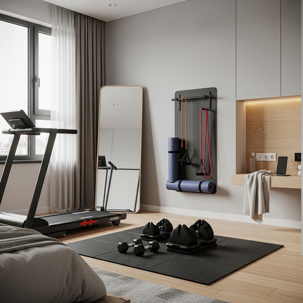 Adjustable dumbbells provide multiple resistance options while saving space, making them ideal for small bedroom gyms. Placing the rack near a mirror not only adds functionality but also makes the room feel larger and more open.