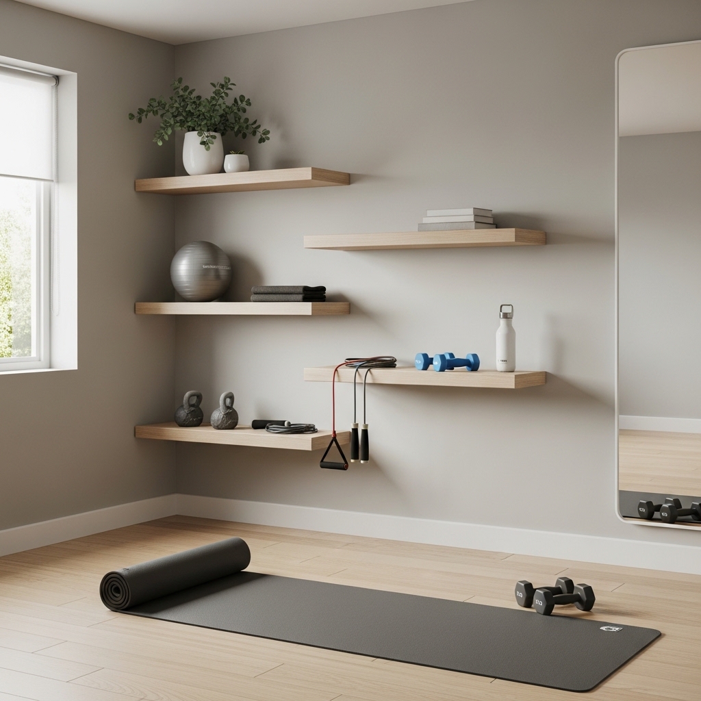Floating shelves save floor space and allow you to display dumbbells, kettlebells, resistance bands, or decor. They make your bedroom gym look neat, organized, and stylish.
