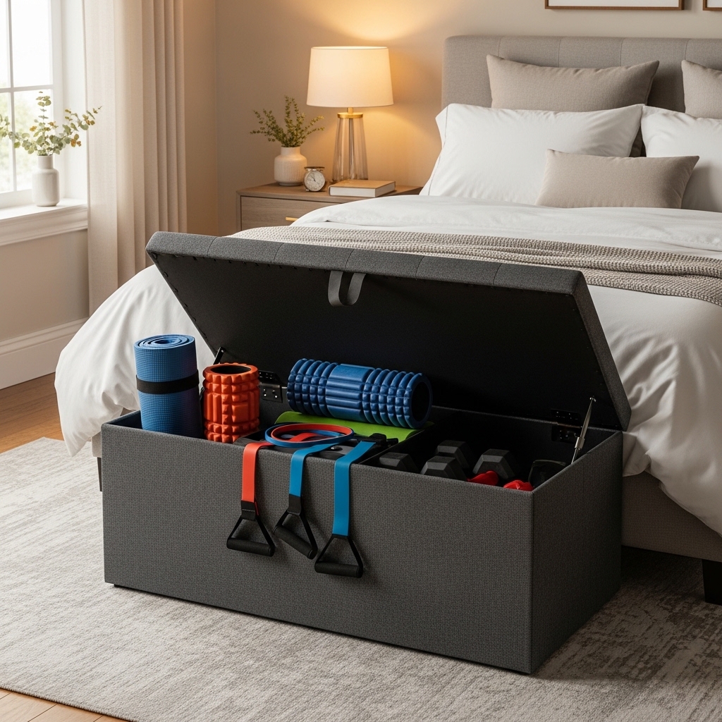 A storage ottoman can hide small equipment like dumbbells, resistance bands, or yoga blocks while doubling as seating.