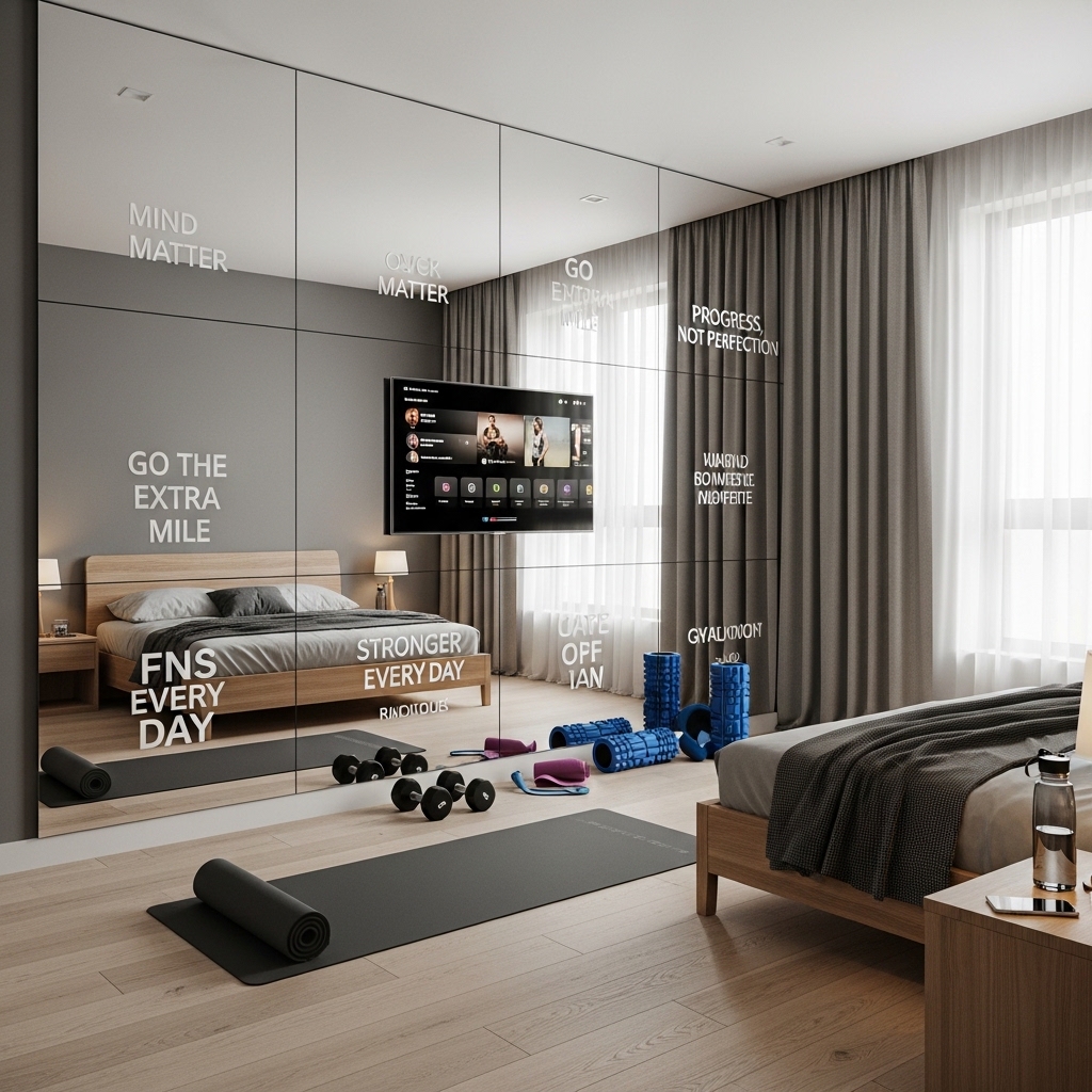 Mirrors not only reflect light but also create the illusion of a larger bedroom while enabling proper form checks during workouts. Installing a full-length or wall-mounted mirror enhances both aesthetics and functionality.