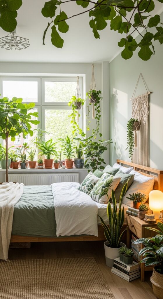 Placing plants on shelves or bedside tables adds natural beauty.