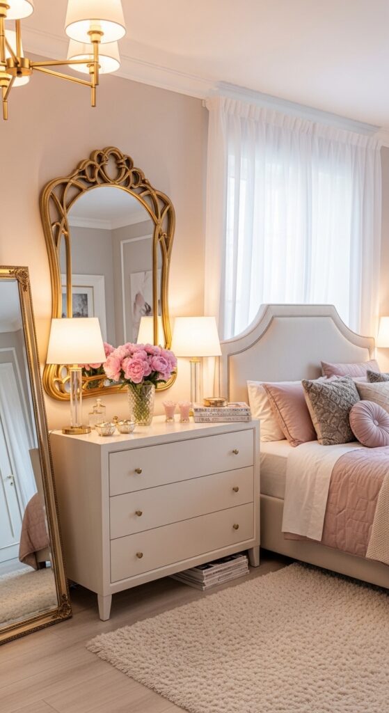 A large floor mirror or a decorative mirror above a dresser can enhance the overall design.