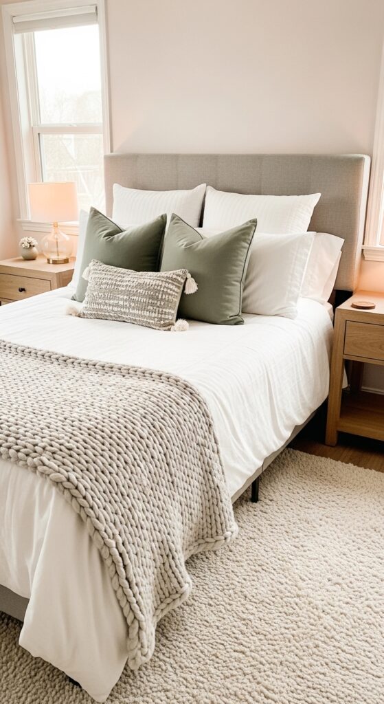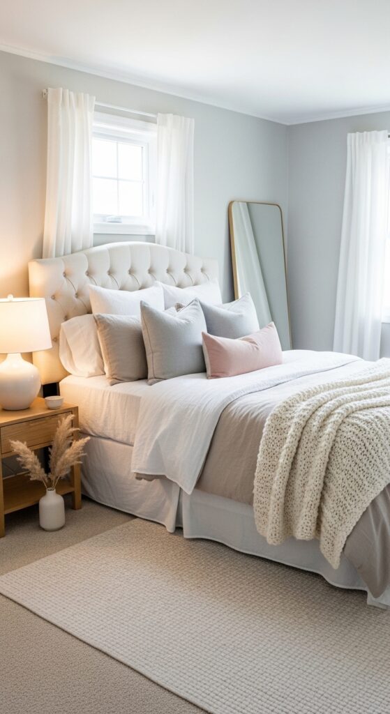 A soft neutral color palette creates a calm and relaxing bedroom environment. Shades like cream, beige, blush pink, and soft gray make the space feel elegant and peaceful.